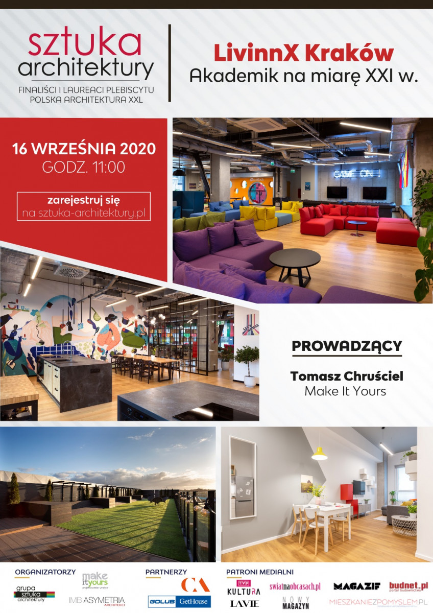 Akademik LivinnX w Krakowie to jeden z najnowocześniejszych tego typu obiektów w Polsce. Autorami projektu, który zdobył nagrodę główną w Plebiscycie Polskie Wnętrze 2019 w kategorii wnętrza publiczne/ głosowanie publiczności, są dwie pracownie Make It Yours oraz IMB Asymetria. I właśnie to wnętrze będzie tematem kolejnej prezentacji online, która odbędzie się 16 września 2020 o godz. 11:00. Wystarczy tylko zarejestrować się.