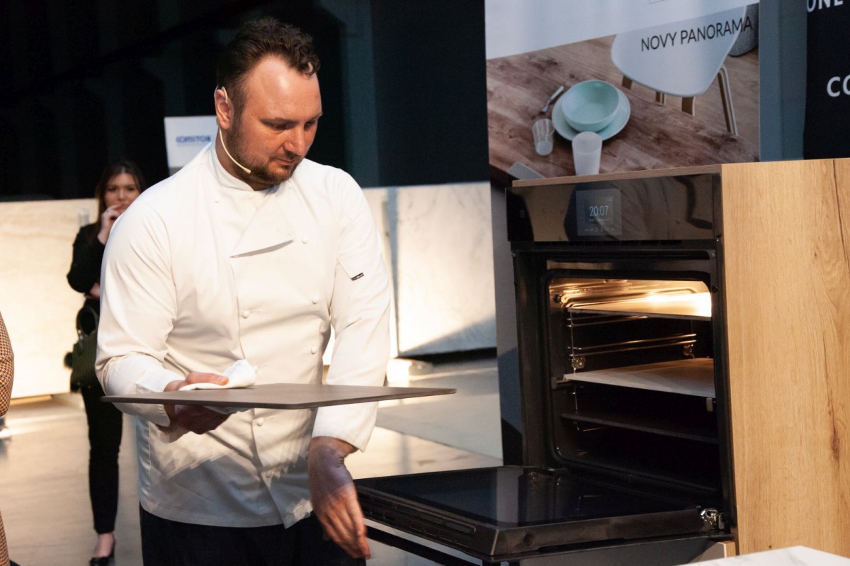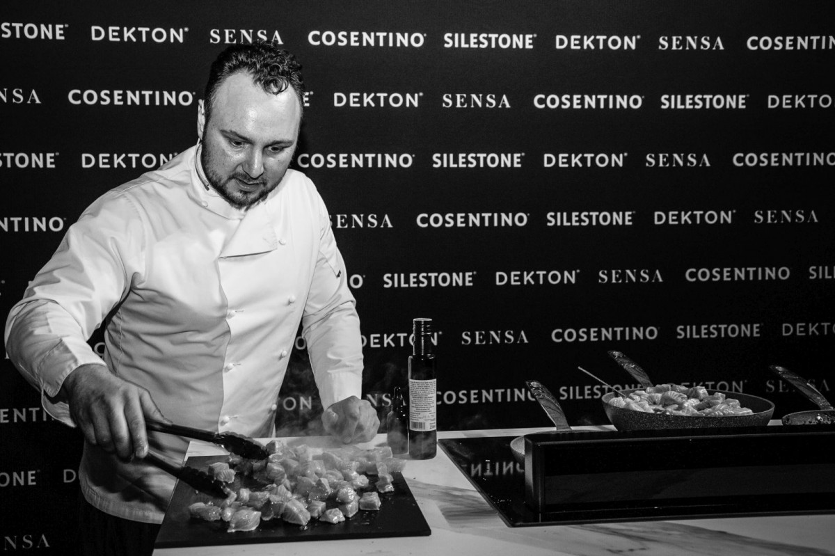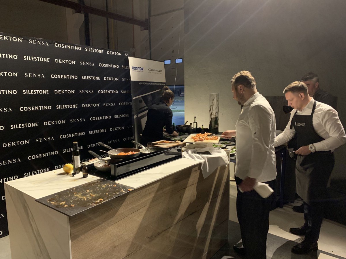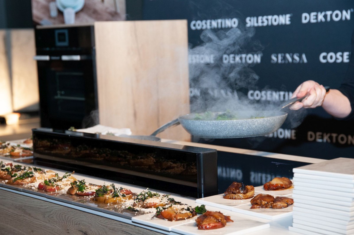 Spotkanie uświetnił live cooking w wykonaniu szefa kuchni restauracji Zoni, Aleksandra Barona, znanego również z telewizyjnego cyklu „Widelcem po mapie”. Kucharz, wraz ze swoją asystentką Martą Dymek, gotowali na żywo w przestrzeni Cosentino,  w towarzystwie wielkoformatowych powierzchni Silestone, Dekton i Sensa. Kulinarny spektakl udowodnił zaawansowanie technologiczne produktów Cosentino. Dekton, dzięki swojej odporności na temperatury, został „upieczony” w bardzo wysokiej temperaturze. Dzięki temu zabiegowi łososia usmażono bezpośrednio na płycie z konglomeratu kwarcowego. Zebrani  mieli możliwość podpatrzenia warsztatu pracy mistrzów i spróbowania wytwornych dań pieczonych w zaawansowanym technologicznie piekarniku Küppersbusch BP 6550.0S, podanych na talerzach stworzonych z najnowszej kolekcji Dekton Stonika, zaprezentowanej podczas spotkania. Proces przygotowania dań odbywał się przy powstałym specjalnie na tę okazję mobilnym modelu wyspy kuchennej, z wbudowanym okapem Panorama firmy NOVY.  Wysuwany z blatu okap umożliwił efektywne wyłapywanie oparów już u źródła, dzięki czemu uczestnicy spotkania nie czuli żadnych zapachów podczas przyrządzania potraw, a po zakończonej pracy urządzenie dyskretnie schowało się w zabudowie. Blat wyspy roboczej wykonany został z materiału Dekton, w kolorze Opera a boczna okładzina stworzona z najnowszej propozycji Cosentino, Dektonu Slim o grubości 4 mm.