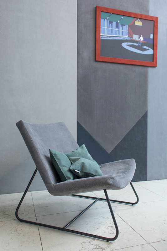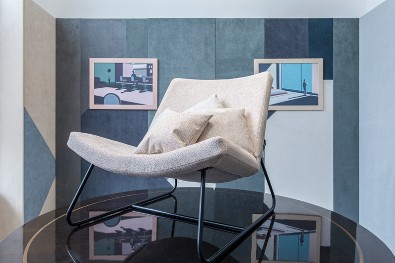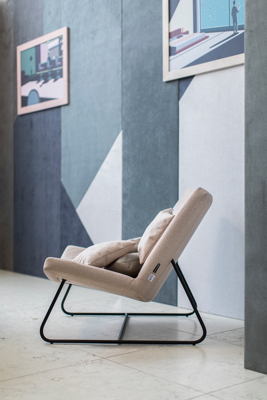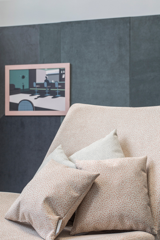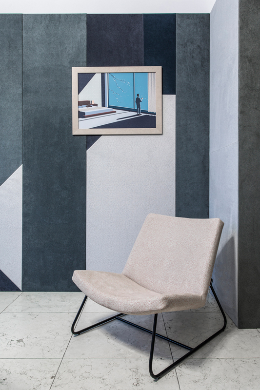 Zapraszamy do obejrzenia zdjęć Marka Swobody dokumentujących wystawę instalacji wykonanej z materiałów „TARA” Alcantara. Część wejścia do galerii Atelier Myszkowski została wyłożona panelami pokrytymi materiałami w kilku stonowanych odcieniach, całość układała się w geometryczną, strzelistą kompozycję. Dodatkowo na ścianach zaprezentowane zostały ilustracje Victora Cavazzioniego oprawione w ramy z materiałów „TARA”. Motywem przewodnim kadrów był człowiek umiejscowiony w konkretnym wnętrzu – apartamencie hotelowym, kawiarni, domu, lotnisku. Na każdym obrazie można było odnaleźć element wzoru „TARA”. Wystawie towarzyszyły też obiekty użytkowe jak fotele obite wersją tkaniny w beżowym odcieniu z czerwonym nadrukiem oraz film przedstawiający animację „TARA”. Mimo połączenia kilku odcieni tkanin wystawa była spójna i harmonijna. To niewątpliwie cecha charakterystyczna podkreślająca kreatywność i szerokie możliwości zastosowania materiału „TARA”.