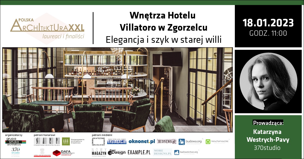 Villatoro to butikowy hotel zlokalizowany w zabytkowej, secesyjnej willi w Zgorzelcu, tuż przy moście granicznym. Budynek został zrewitalizowany oraz zaadaptowany do nowych funkcji z zachowaniem historycznego charakteru obiektu. Wnętrze hotelu jest bardzo eleganckie a na uwagę zasługują współczesne dodatki. Zapraszamy na prezentację zwycięskiego projektu w kategorii wnętrza publiczne w głosowaniu publiczności Plebiscytu Polska Architektura XXL 2021 w ramach cyklu Finaliści i laureaci Plebiscytu Polska Architektura XXL. Porozmawiamy z Katarzyną Westrych-Pavy z pracowni 370studio o tej realizacji, pracy biura i planach na przyszłość. Widzimy się 18 stycznia 2023 o godz. 11:00. Zapisz się już teraz.
