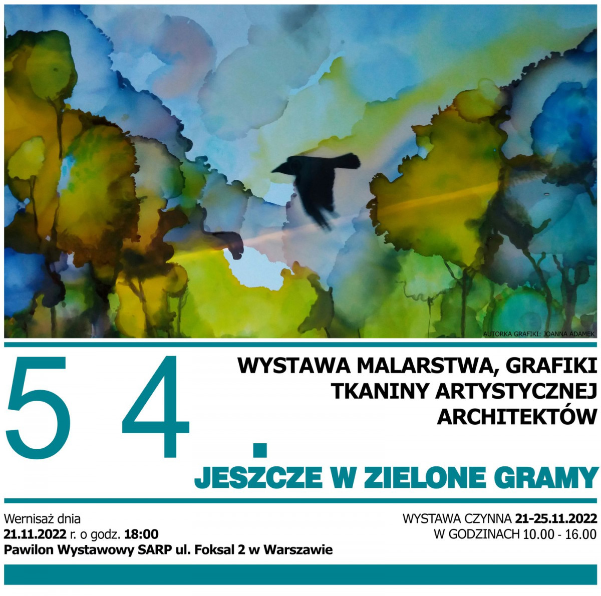 54. Wystawa malarstwa, grafiki, tkaniny artystycznej architektów będzie miała miejsce w Pawilonie Wystawowym SARP w Pałacu Zamoyskich przy ul. Foksal 2 w Warszawie. Wystawa potrwa do 25.11.2022 i można będzie ją zwiedzać w godzinach 10.00-16.00.