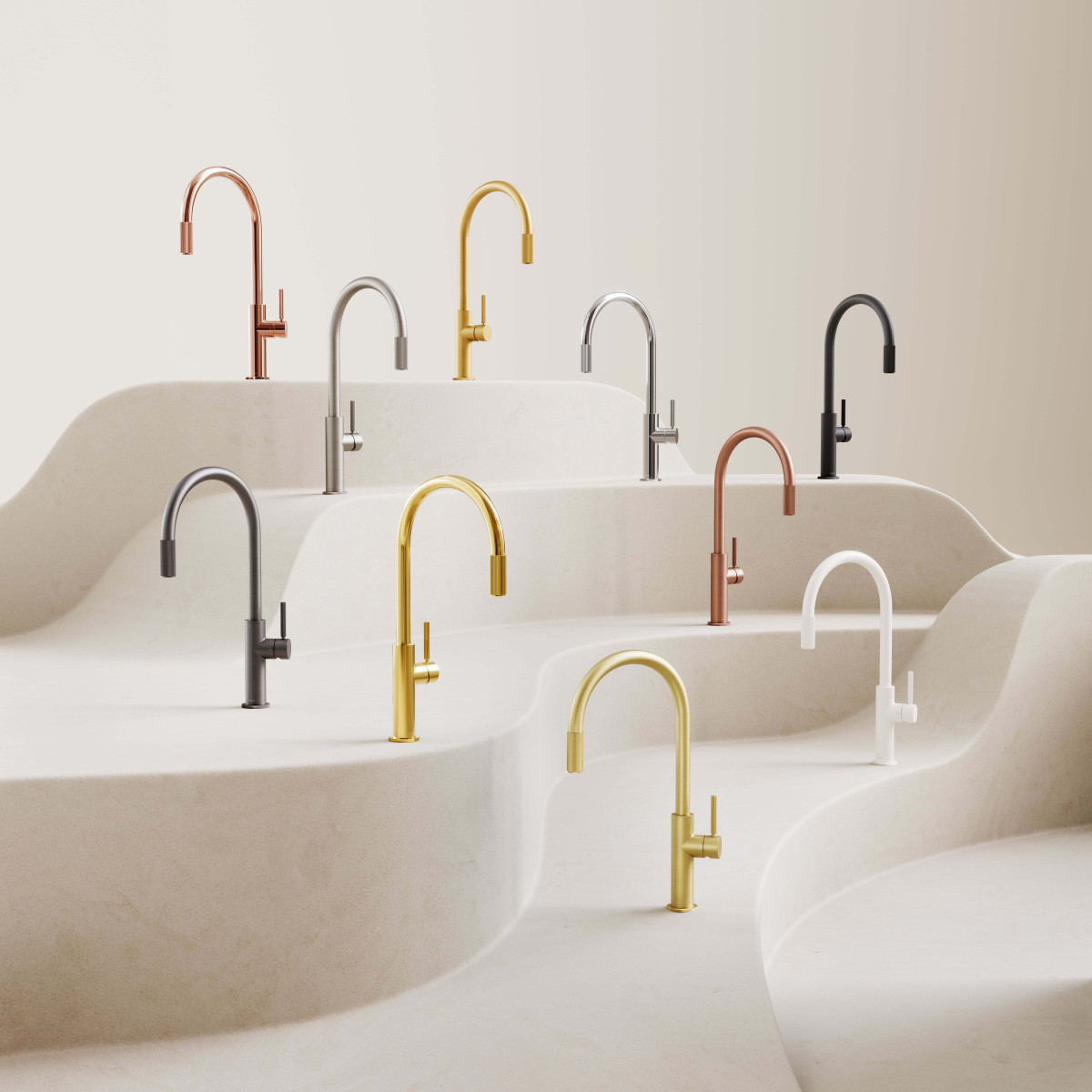 Mosiądz, złoto, miedź, biel, chrom, nikiel, grafit i czerń. Szeroka gama kolorów baterii dostępna jest w zróżnicowanych teksturach: połysk, szczotkowanie oraz mat. Kolorystyka wykończeń kolekcji OMNIRES SWITCH została zainspirowana najbardziej szlachetnymi materiałami, aby każdy mógł podkreślić indywidualny wystrój i charakter swojej kuchni.