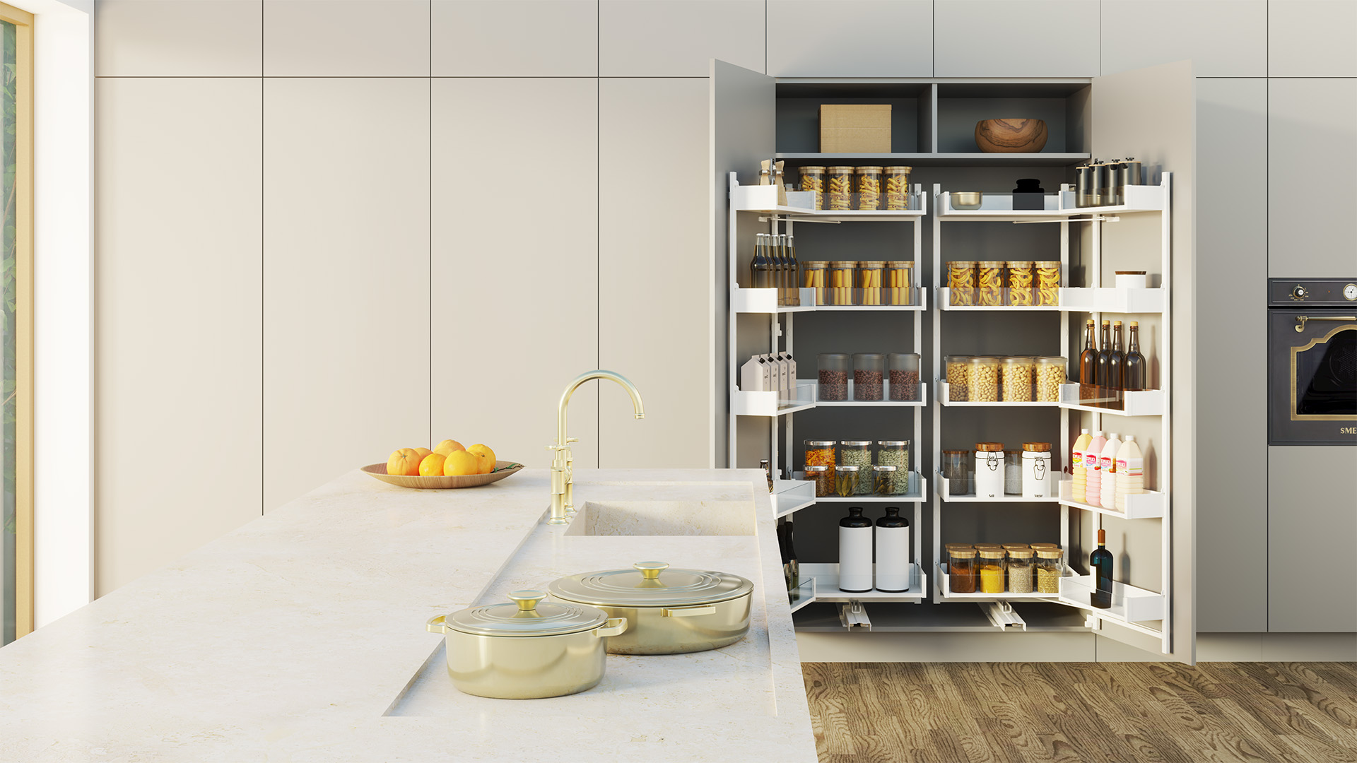 Cargo Maxi Space to funkcjonalne rozwiązanie, które po otwarciu frontu automatycznie wysuwa się na zewnątrz, zapewniając pełny wgląd w zawartość i wygodny dostęp do wszystkich przechowywanych produktów – bez konieczności sięgania w głąb szafki.