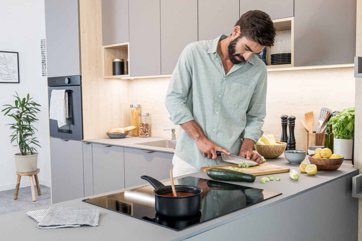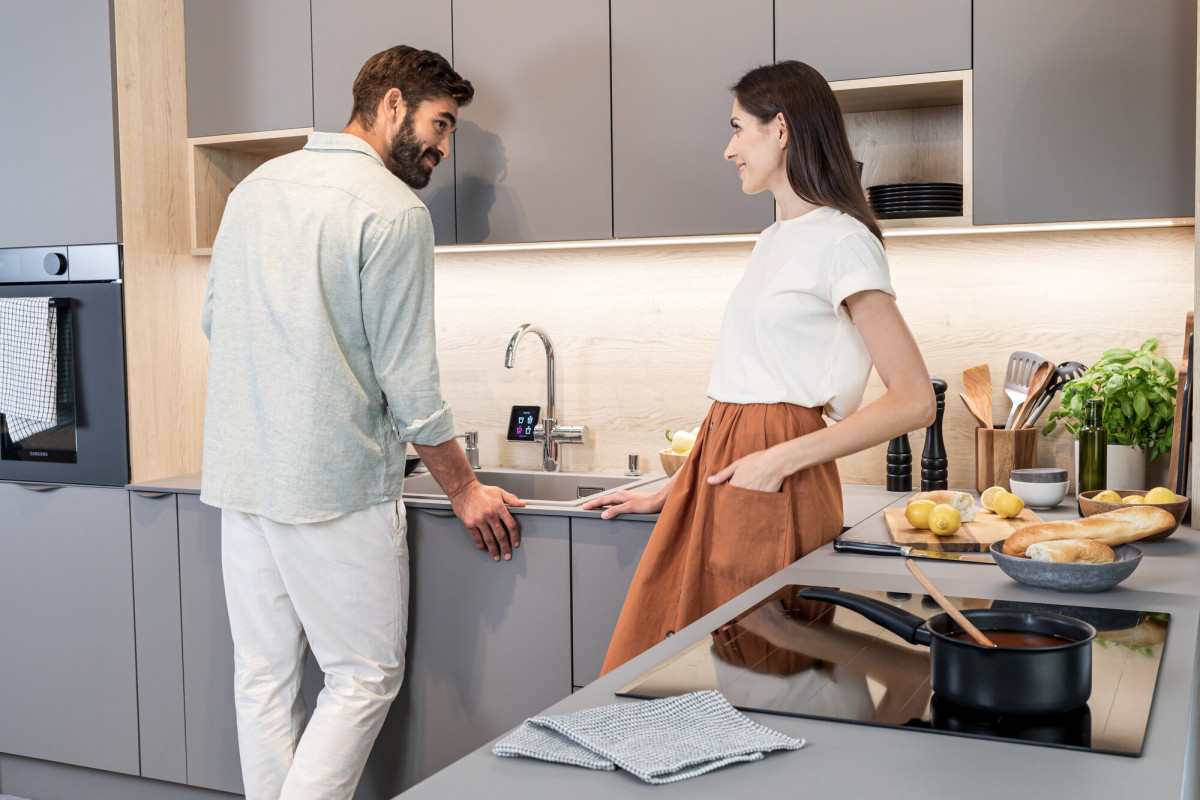 Kuchnia to obok łazienki najbardziej wymagające wnętrze w domu pod względem doboru odpowiednich mebli. To jasne, że szukamy mebli, które odpowiadają nam stylem czy kolorem, ale oprócz niego warto pamiętać, że meble kuchenne powinny być wytrzymałe na panujące tu warunki. Wysoka temperatura, para wodna, tłuszcz, dzienne światło i odciski palców – wszystkie te czynniki nie sprzyjają meblom i szybko weryfikują, czy wybrana zabudowa została wykonana w wysokiej, czy średniej jakości. Na zwykłych meblach, często lakierowanych, już po krótkim użytkowaniu mogą pojawić się odpryski, naderwania czy w przypadku tych foliowanych widoczne są spuchnięcia, a fronty pod wpływem słońca mogą zmienić oryginalny kolor. Co więcej, w miejscu łączenia krawędzi z frontem mebla gromadzi się brud, a zdarza się, że i obrzeże po czasie odrywa się i nie tylko mało estetycznie to wygląda, ale i niszczy cały front. Dlatego warto wiedzieć, że łączenie obrzeży z frontem REHAU można wykonać w technologii bezspoinowej – co daje efekt monolitycznego mebla bez widocznej fugi. Co to oznacza w praktyce? Twoje meble posłużą Ci dłużej, będą bardziej odporne, a estetyka Cię zachwyci – gwarantujemy. Brak widocznych łączeń zapewnia genialną estetykę – monolitycznego frontu.