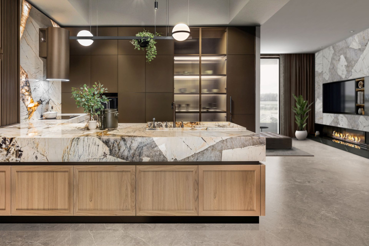 Znaczące tło dla wyspy kuchennej stanowi poprowadzona na całą ścianę wysoka zabudowa. Jej brązowe fronty z lakierowanym, metalicznym połyskiem Beryllium Bronze, rozświetlają refleksy kamienia. Kryje ona wszystkie niezbędne sprzęty AGD, w tym dwie zmywarki umieszczone na wysokości, co znacznie ułatwia codzienne korzystanie ze sprzętu. Oferuje przy tym całkiem sporo miejsca do przechowywania. Monolityczny charakter wysokiej zabudowy przełamuje dwustronna witryna z aluminiową ramką w kolorze brązu, wypełniona dymionym szkłem flutes. To nowoczesny akcent, który doskonale koresponduje z połyskującą powierzchnią kamienia, udowadniając, że w tej kuchni nie ma miejsca na przypadek.