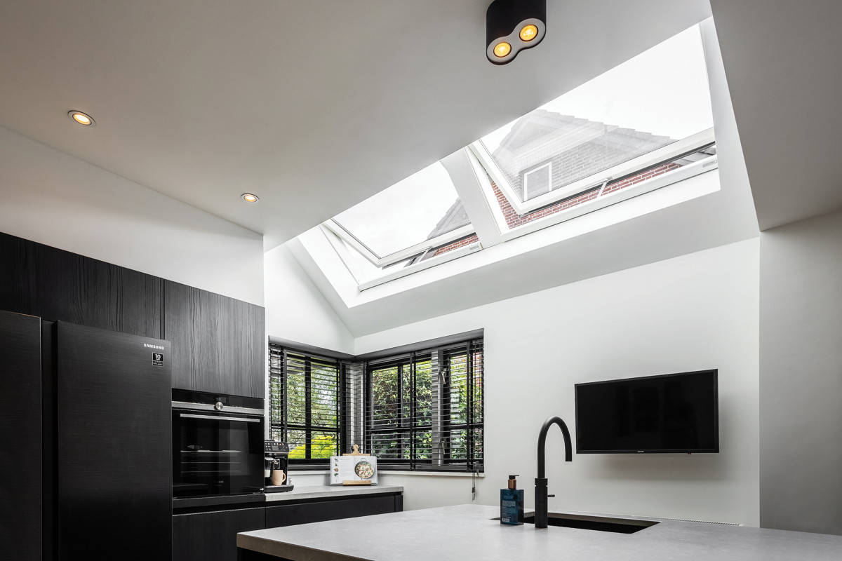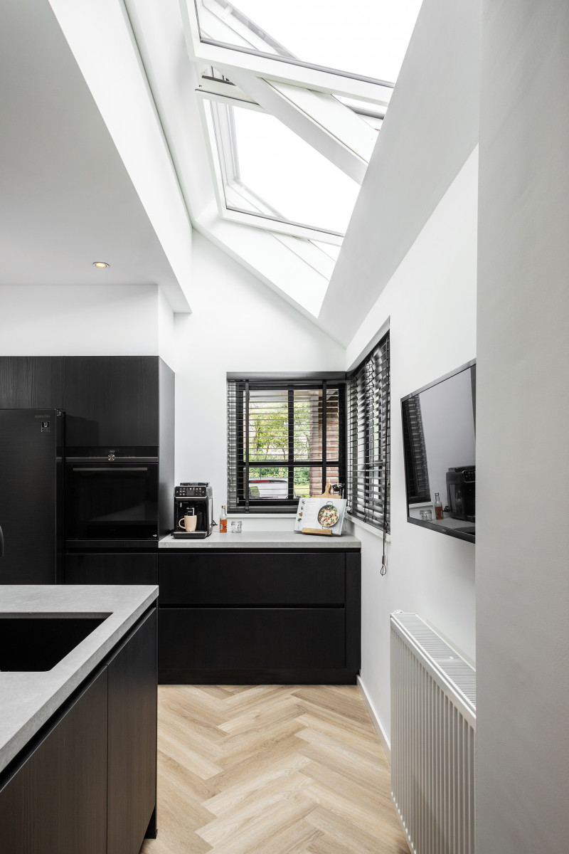 Właściciele tego nowoczesnego domu w Groesbeek w Holandii niedawno odnowili swoją kuchnię. Znajdujące się w niej okna narożne nie wpuszczały do środka zbyt wielu promieni słonecznych. Postanowili więc wykorzystać oryginalny dach na zamontowanie w nim dodatkowych okien, aby doświetlić i rozjaśnić wnętrze. Okna dachowe zamontowane wysoko w stropie wpuszczają maksymalnie dużo światła, które daje radość i pobudza do pracy. Zobaczcie jak wygląda teraz miejsce gdzie powstają pyszne kulinaria.