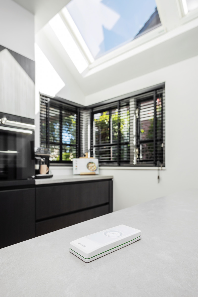 W dachu nad kuchnią zamontowano dwa duże obrotowe okna dachowe zasilane energią elektryczną w bezprzewodowym systemie Z-Wave. Teraz oknami można łatwo i komfortowo sterować za pomocą pilota lub smartfona! Kiedy trzeba przewietrzyć kuchnię – wystarczy wziąć do ręki pilot lub telefon i jednym kliknięciem otworzyć lub zamknąć okno. Okna, wybrane do tej kuchni, pomalowane są potrójną warstwą lakieru poliuretanowego w kolorze białym, która tworzy na drewnie idealnie gładką powierzchnię. Sprawia to, że są one wyjątkowo odporne na wilgoć więc doskonale nadają się do pomieszczeń, takich jak łazienki i kuchnie.