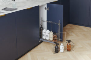 W cargo umieścić można również detergenty, które choć w kuchni niezbędne, nie powinny stać obok żywności. Tu warto wybrać model ze specjalnie wyprofilowanym koszykiem z drutu (Cargo Mini Dolne z linii Variant MULTI), który można wyjąć ze stelaża i zabrać np. do innego pomieszczenia, gdzie środki czystości są akurat potrzebne.
