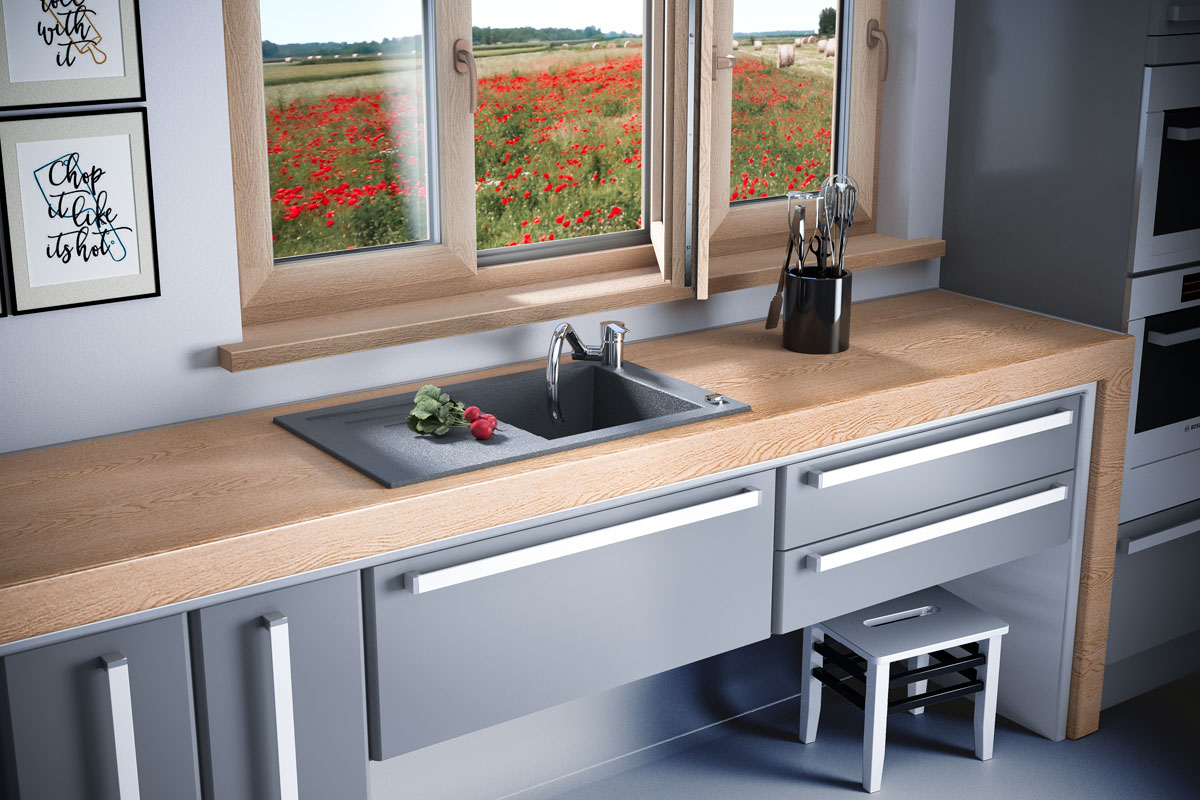 Zlewozmywaki kuchenne umieszczane pod oknem wyglądają bardzo ciekawie. Dodatkowo zapewniają dużą ilość światła naturalnego, podnoszącego komfort codziennego mycia naczyń. W związku z nimi może jednak powstać jeden problem: chcąc wybrać wyższą baterię sztorcową (np. w kształcie litery U czy L) możemy sprawić, że skrzydło okienne nie będzie miało możliwości otwarcia. Rozwiązaniem są tu baterie zlewozmywakowe ze składaną wylewką, takie jak Laveo LILA.