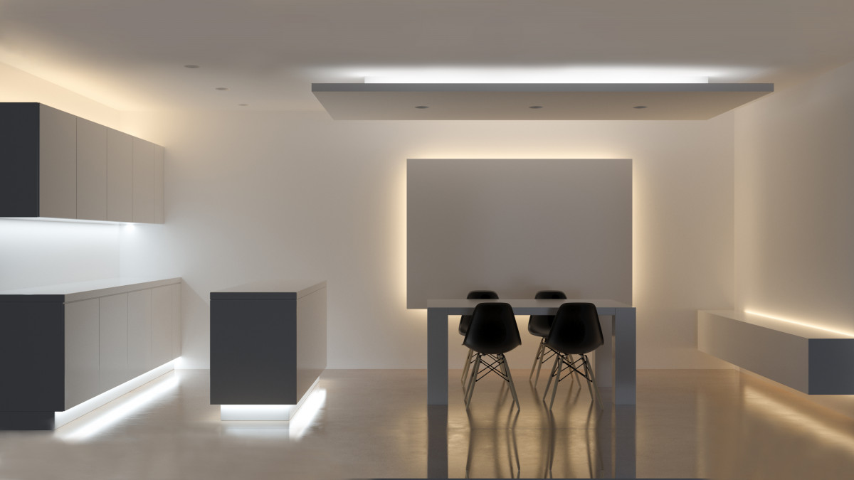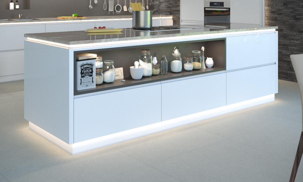 Chodzi o możliwość przełączania temperatury barwowej światła pomiędzy ciepłą a zimną. Barwa światła buduje nastrój, atmosferę, a to coraz ważniejsza rola światła, także w kuchni, gdzie inna barwa sprawdzi się o środku dnia, a inna wieczorem. – Możliwość zmieniania temperatury barwowej dają nam taśmy LED Multi White – informuje Michał Kichler. – Można je zintegrować z systemami nowej generacji, które pozwalają zdalnie sterować także natężeniem światła, a nawet programować swojego rodzaju świetlne sceny, scenariusze. Kontrolujemy światło przy pomocy telefonu lub przełącznika komunikującego się w technologii Bluetooth Mesh, całkowicie rezygnując z przewodów. To bardzo wygodne i funkcjonalne.
