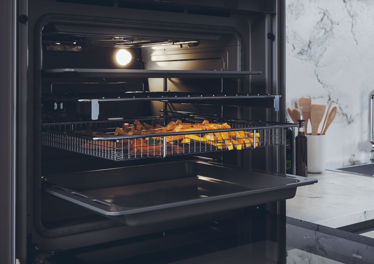 Chłodny front piekarnika Candy zapewnia bezpieczeństwo i ochronę przed poparzeniem podczas pieczenia. Nowe szklane drzwi zewnętrzne nagrzewają się średnio do zaledwie 55°C, podczas gdy temperatura wewnątrz piekarnika wynosi 200°C. Oprócz tego, bezpieczny i wygodny dostęp do przygotowywanych potraw zapewniają stabilne prowadnice teleskopowe. Dzięki nim można wysunąć ruszt niemal w całości, nawet w przypadku ciężkich dań. Solidna konstrukcja gwarantuje, że potrawy nie przechylą się ani nie wypadną podczas wyciągania. Dzięki technologii Soft Close system spowalnia zamykanie drzwi, chroniąc je przed uszkodzeniem, przypadkowym zamknięciem lub trzaśnięciem.