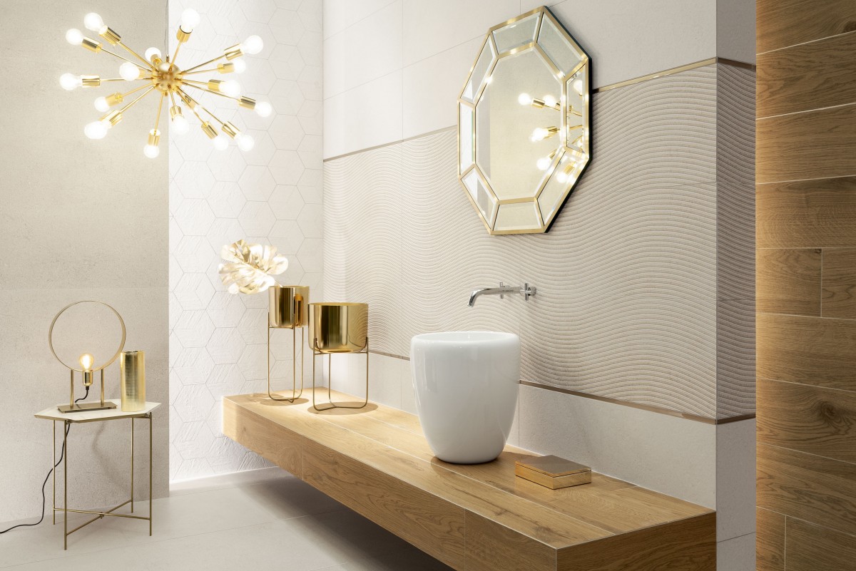 Chcąc stworzyć niebanalną aranżacją należy umiejętnie i z wyczuciem zestawiać ze sobą kolory i faktury. Aby efekt końcowy nie był odwrotny od zamierzonego, dominantą wystroju powinny być barwy o neutralnej kolorystyce. Będą bowiem stanowiły odpowiednie tło dla wprowadzanych akcentów wizualnych, zarówno w postaci płytek w innych kolorach, jak również roślin, obrazów czy dekorów. Odcienie szarości i beżów stanowią równocześnie ponadczasowy symbol elegancji, który w przypadku kolekcji Balance od Ceramiki Tubądzin, jest urozmaicany, dzięki strukturalnym dekorom i heksagonalnym mozaikom, charakteryzującym się nowoczesnymi fakturami oraz zdobieniami. Powierzchnia płytek z kolekcji Balance nawiązuje do struktury betonu, która ocieplana jest, dzięki występującym w kolekcji gresom odwzorowującym drewno oraz szklanym listwom w złotym odcieniu.