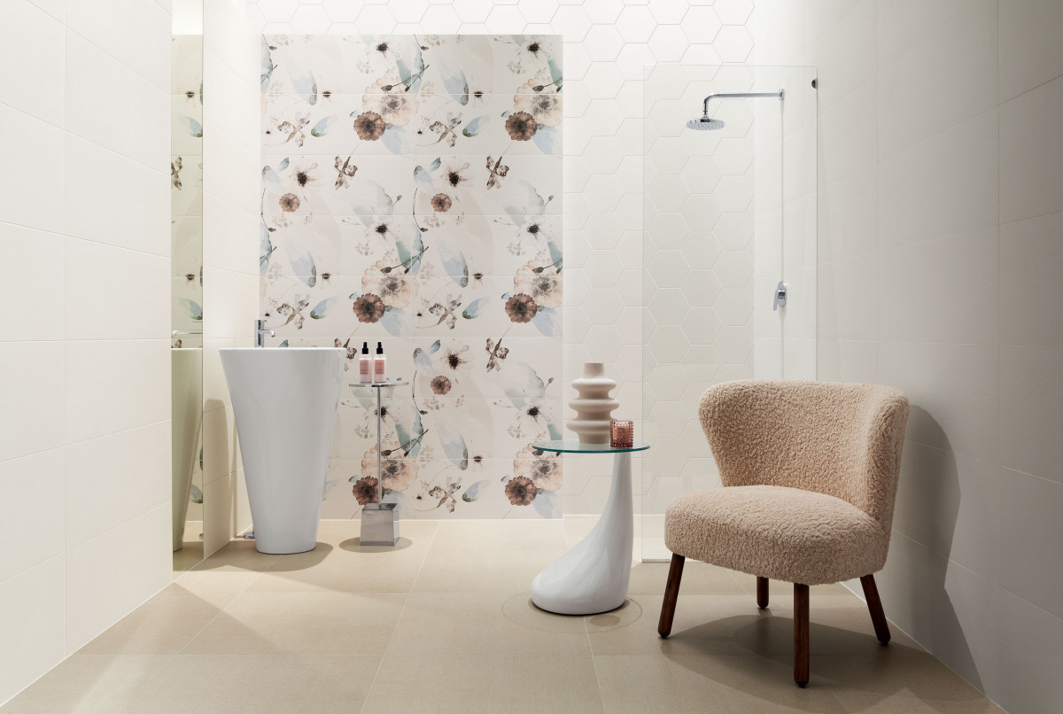 Oprócz 3-elementowych dekoracji ściennych (894 x 748 mm, cena 219,92 zł za szt.) w kolekcji znajdziemy także płytki w kształcie heksagonów – zarówno w wersji kwiatowej (19,93 zł za szt.), jak i w klasycznej bieli (17,96 zł za szt.).