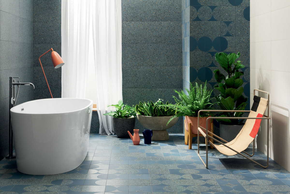 Chcąc uchwycić klimat lat 70. i 80., Maciej Zień postawił na żywą kolorystykę oraz kultowy wzór lastryko. Popularne terazzo pojawia się w propozycji Funky we współczesnej, wielobarwnej odsłonie, wypełniając wnętrze radosnymi barwami, odważną formą i mieniącymi się drobinkami, które przypominają widowiskowo rozrzucone w powietrzu konfetti. Bazę kolekcji stanowią płytki ścienne w podstawowym formacie 33 x 90 cm, dostępne w czterech wersjach kolorystycznych: Funky White, Pink, Blue i Green. Ich odpowiednikami są uniwersalne płytki gresowe w kształcie kwadratu (598 x 598 mm). Wszystkie płytki z kolekcji Funky mają wykończenie matowe.