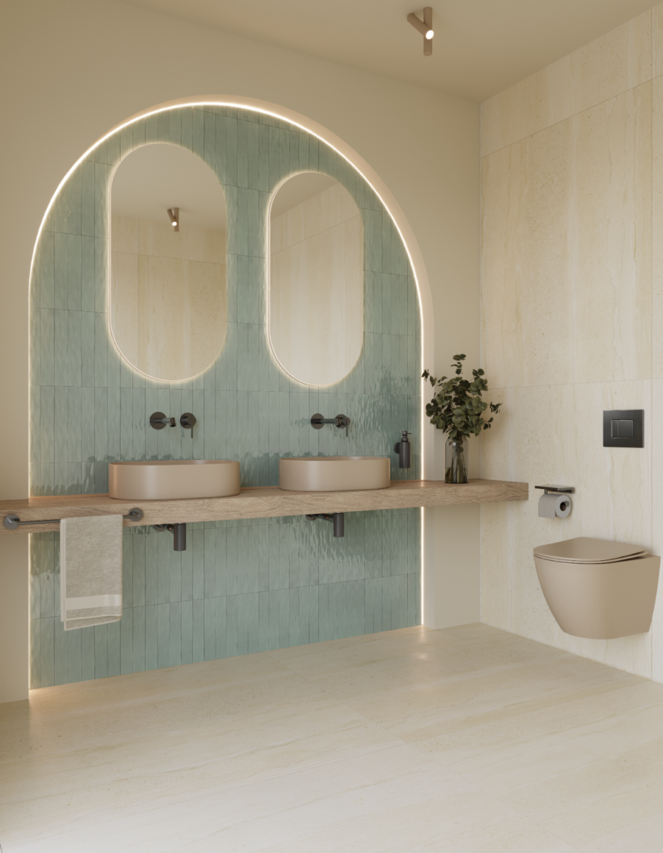Beżowa ceramika łączy uniwersalność z wyrafinowaną estetyką. Jest cieplejsza od klasycznej bieli, delikatniejsza niż złamana kość słoniowa, subtelnie ocieplając przestrzeń. Beżowa miska WC w duecie z umywalką ROSIE tworzy miękką, harmonijną kompozycję, która doskonale współgra z naturalnymi materiałami, takimi jak drewno, kamień czy jasne płytki.