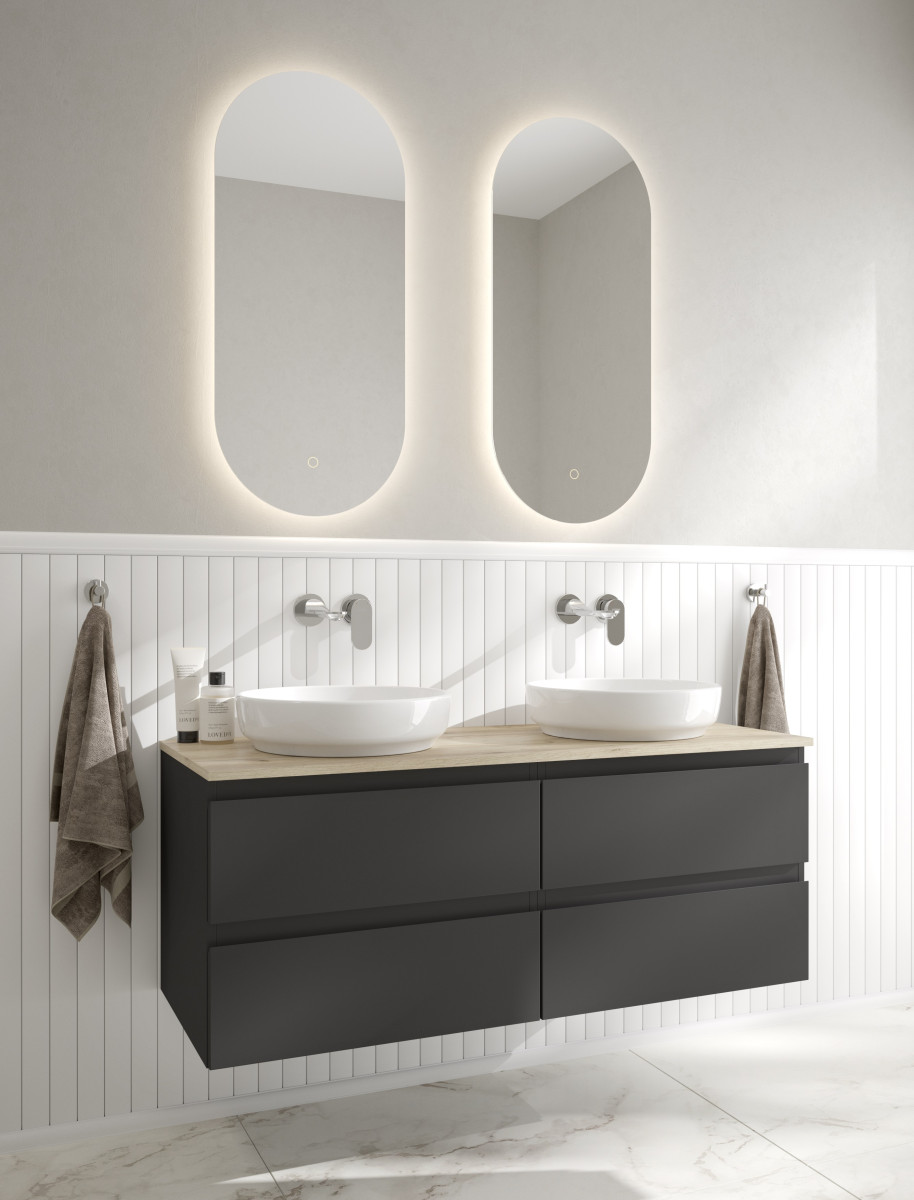 Aby stworzyć swoją ulubioną kompozycję można wybierać spośród korpusów i blatów w kilku kolorach. Szafki dostępne są w kolorach: biały połysk, czarny mat, szary mat oraz grafit mat. Można połączyć je z blatem w kolorach: biały połysk, czarny mat, szary mat, grafit mat lub dąb. Do tego wystarczy dobrać białą lub czarną umywalkę Oltens i baterię Oltens dostępne w wielu modelach i kolorach. Miksuj dowolnie!
