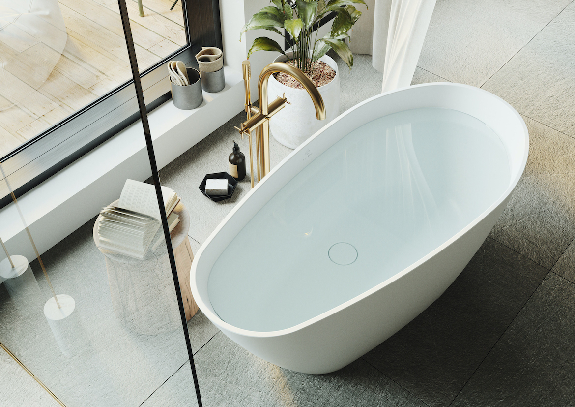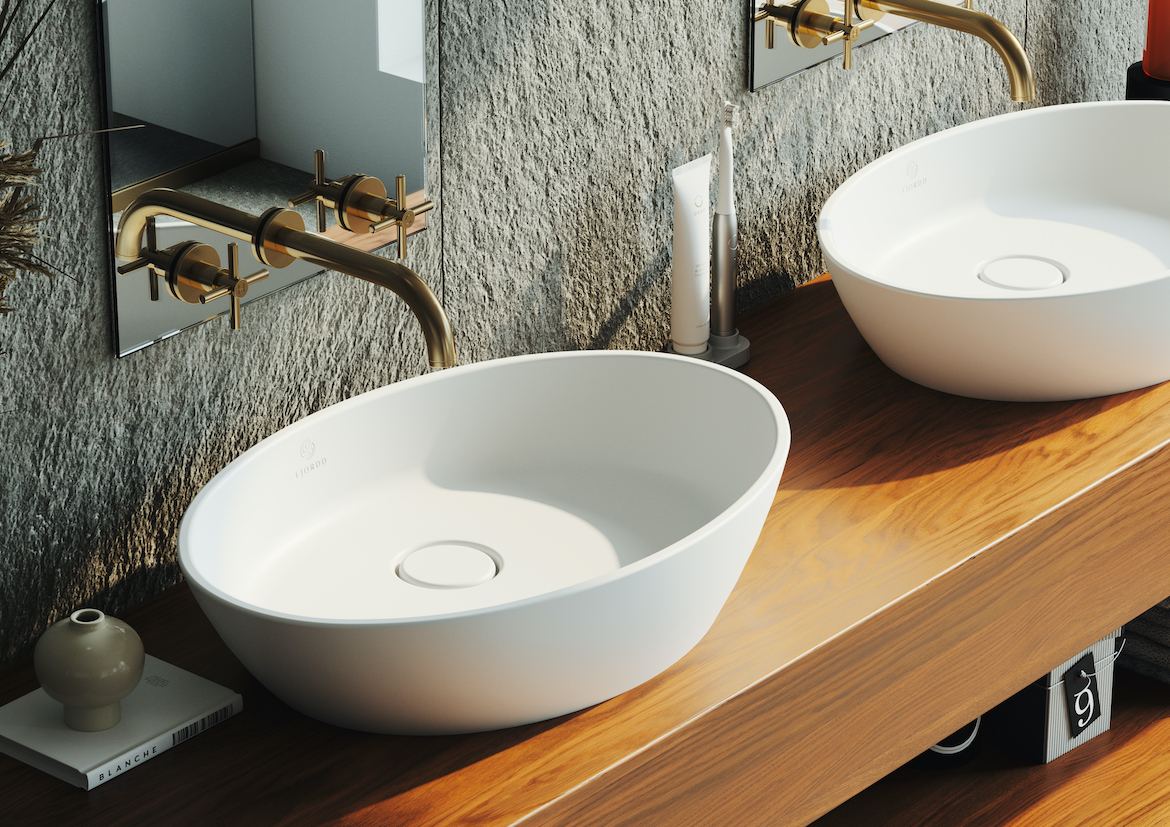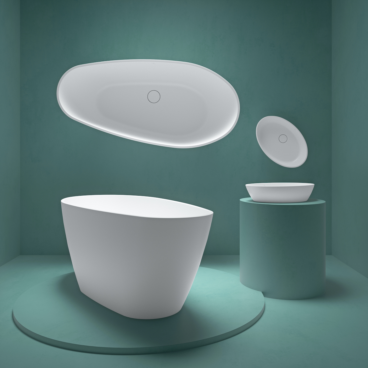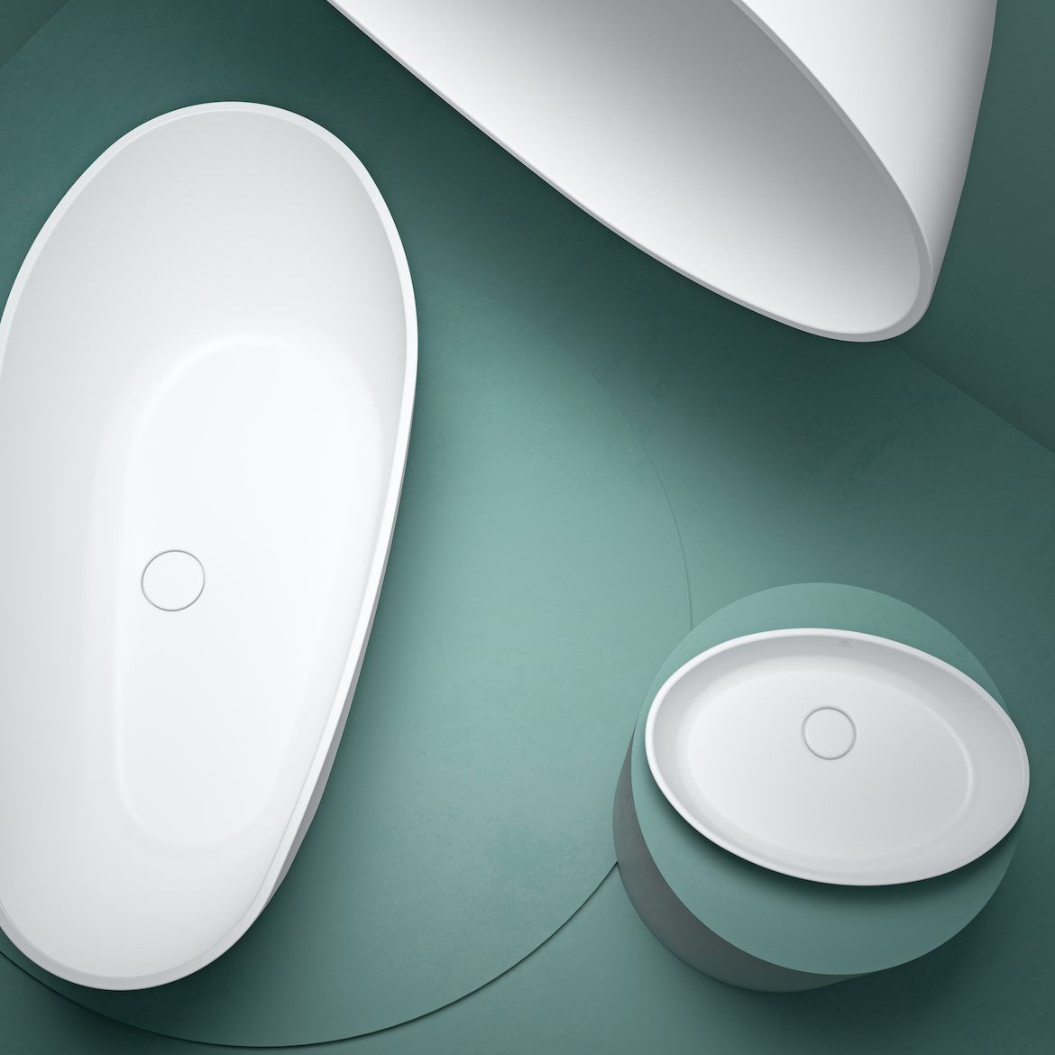 Kształt wanny inspirowany jest grotem strzały z charakterystycznie zarysowanymi łukami. Wizualnie intrygujący, a funkcjonalnie pozwalający naturalnie i wygodnie ułożyć ciało podczas relaksującej kąpieli. Dzięki jej dużym rozmiarom i odpowiedniej ergonomii nawet we dwoje. Wanna zjawiskowo prezentuje się w wersji wolnostojącej, mimowolnie przyciągając wzrok swoją harmonijną i przemyślaną formą, stając się idealnym centrum domowego SPA. Można ją jednak również umiejscowić przy ścianie, wyposażając w klasyczną baterię ścienną. Umywalka SENJA o lekko owalnej, podłużnej misie nie jest głęboka, lecz dość przestronna. Tym samym zapewnia duży komfort podczas codziennej pielęgnacji rąk i twarzy. Przy okazji optycznie harmonijna uprzyjemnia te chwile. Jest ona dostępna w wersji nablatowej. Dzięki estetycznym korkom wykonanym z tego samego materiału zarówno umywalka, jak i wanna są jednolite kolorystycznie i spójne w formie. W warstwie funkcjonalnej jest to cenny atut, pozwalający zupełnie swobodnie dopasować do nich stylistykę i kolor baterii.