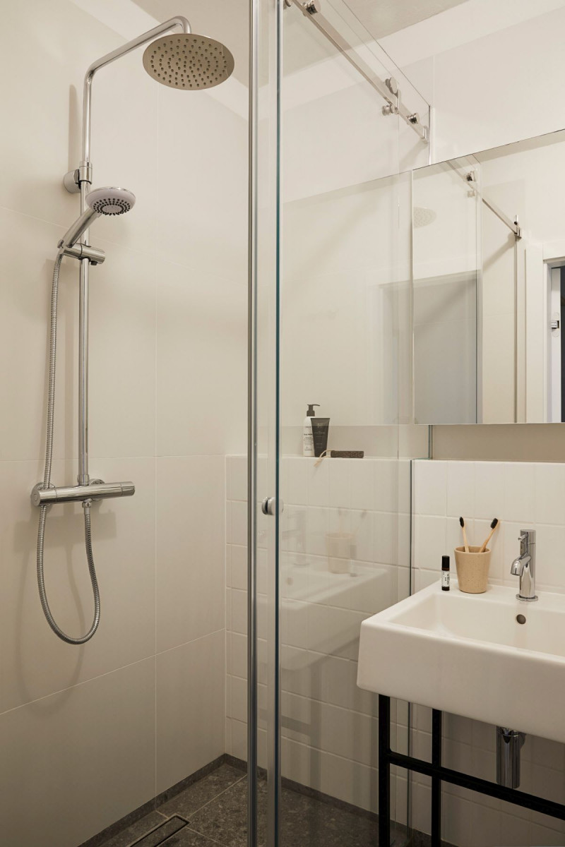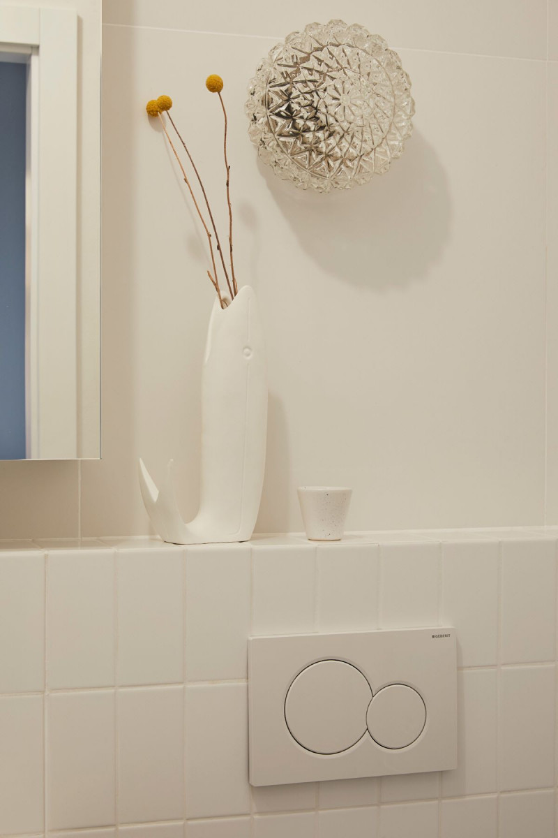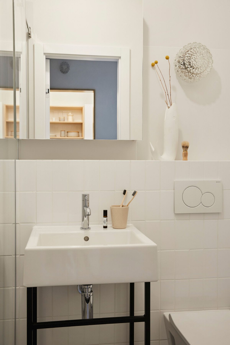 Pomieszczeniem, które przeszło największą metamorfozę jest łazienka. Przed remontem była urządzona skromnie – ze starą wanną na nóżkach, sedesem ze spłuczką, ścianami wykończonymi kilkoma rzędami płytek, lamperią z farby i z lastryko na podłodze. – Podczas projektu ważne dla nas było hasło „less waste”. Zadbałyśmy o to, żeby część wyposażenia po odświeżeniu można było ponownie wykorzystać, a zbędne rzeczy – sprzedać lub oddać. Zachowałyśmy oryginalny drewniany parkiet ułożony w tzw. pasy łowickie, a także kilka drobiazgów. Chciałyśmy także zostawić starą, żeliwną wannę, ale młodzi lokatorzy woleli prysznic – opowiadają Jola Skóra i Anna Olga Chmielewska. Łazienka zmieniła się nie do poznania. Znalazły się tutaj sprzęty lekkie wizualnie o nowoczesnych, prostych formach – umywalka KOŁO Twins zamontowana na stalowej konsoli. Ta kolekcja umywalek to ukłon w stronę modernistycznej stylistyki. Jej geometryczne kształty i elegancka symetria dodają łazience charakteru. W łazience pojawia się także podwieszana miska WC Koło Modo Rimfree, która z łatwością dopasowuje się do wnętrza o każdym metrażu, zajmując zdecydowanie mniej miejsca niż miska stojąca. Miska zawieszona jest na stelażu podtynkowym Geberit. Dzięki takiemu dobraniu elementów wyposażenia niewielka przestrzeń, oprócz tego, że zyskała na komforcie, wydaje się także wizualnie większa. Zabudowa stelaża toalety pełni funkcję półki na akcesoria, a nad nią została umieszczona szafka łazienkowa z lustrem. Kryształowy kinkiet w łazience to jeden z elementów wyposażenia mieszkania, które zostało po poprzednich właścicielach.