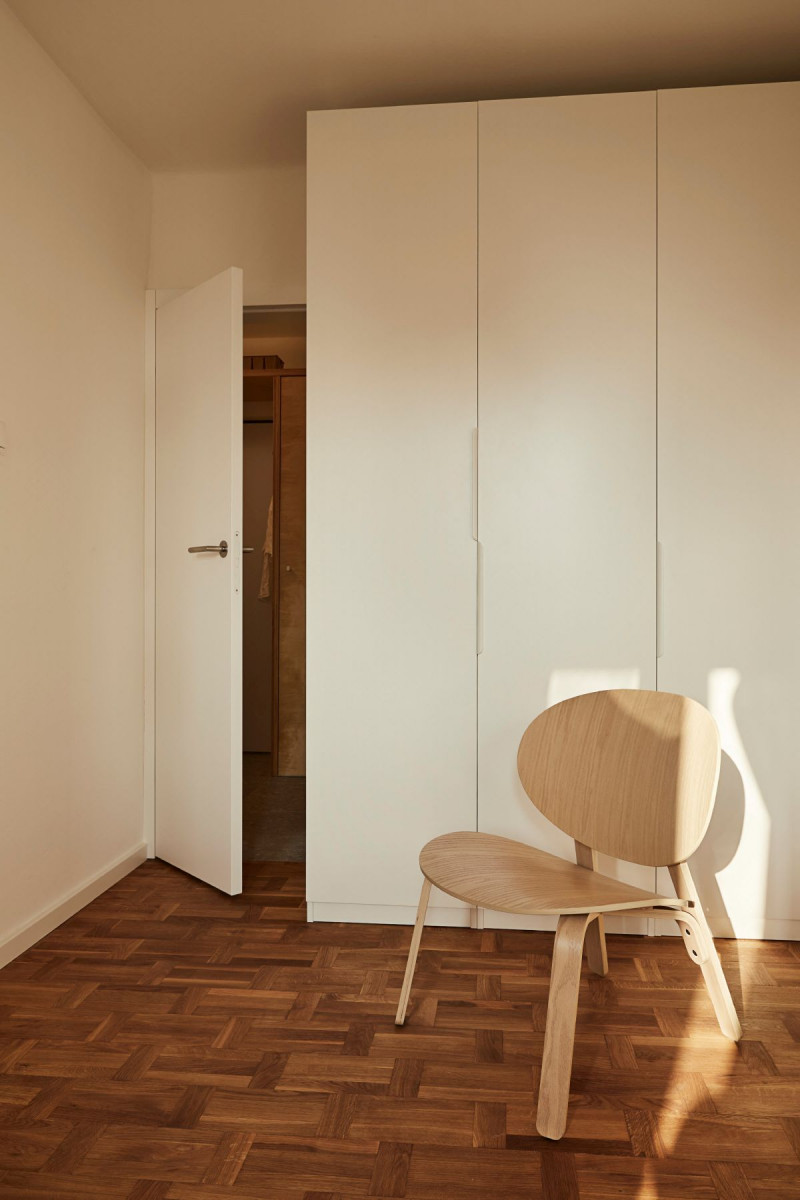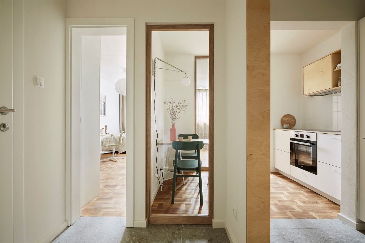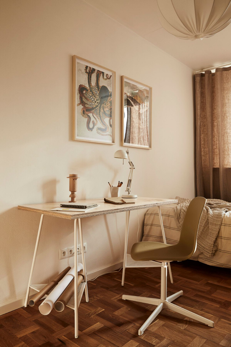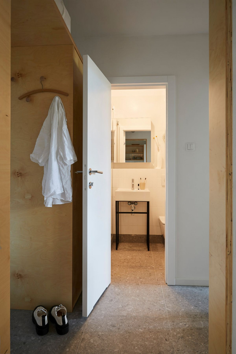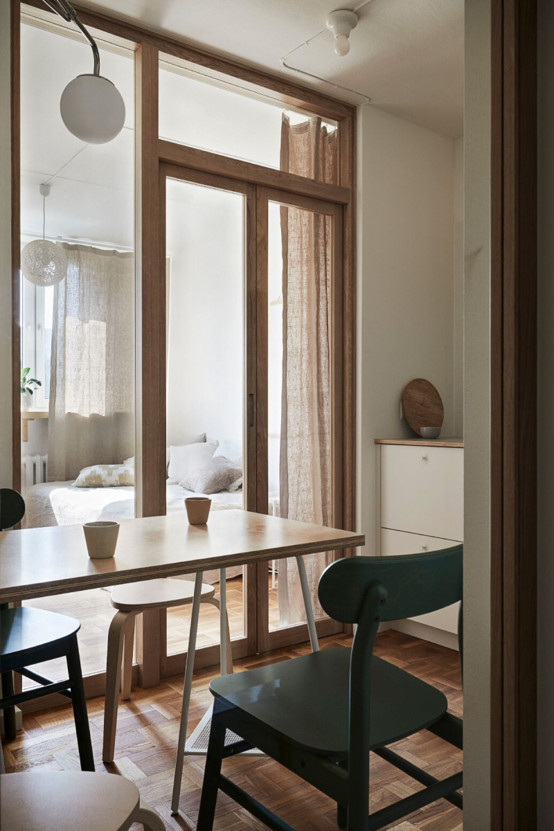 W przestrzeni udało się wygospodarować dwa osobne pokoje oraz komfortową przestrzeń wspólną. Sypialnie młodych mężczyzn mają wszystko, czego potrzeba studentom – miejsce do odpoczynku, pracy i przechowywania rzeczy osobistych. Wcześniej niewielka, ślepa kuchnia, do której światło docierało przez okno wychodzące na pokój, została teraz doświetlona za pomocą przeszklonej ściany z drzwiami do jednego z pokojów oraz okna wychodzącego na przedpokój. Przeszklenie pomiędzy jadalnią, a jedną z sypialni w razie potrzeby można przesłonić lnianą zasłoną znajdującą się od strony pokoju. Kosztem powierzchni jednego z pokojów powiększono metraż kuchni, dzięki czemu zmieścił się w niej stół. Dla studentów wspólna przestrzeń do spożywania posiłków i miejsce, gdzie można spędzić czas ze znajomymi, były bardzo ważne. Aranżacja stylem nawiązuje do lat, z których pochodzi budynek. Projektantki celowo nie wyrównywały ścian i poprowadziły kable elektryczne na wierzchu. Meble i elementy z drewna oraz sklejki wprowadzają nieco oldschoolowy klimat. Wyposażenie – w rozsądnym budżecie, ale dobrej jakości i w większości od polskich producentów i projektantów – jest proste, estetyczne i funkcjonalne.