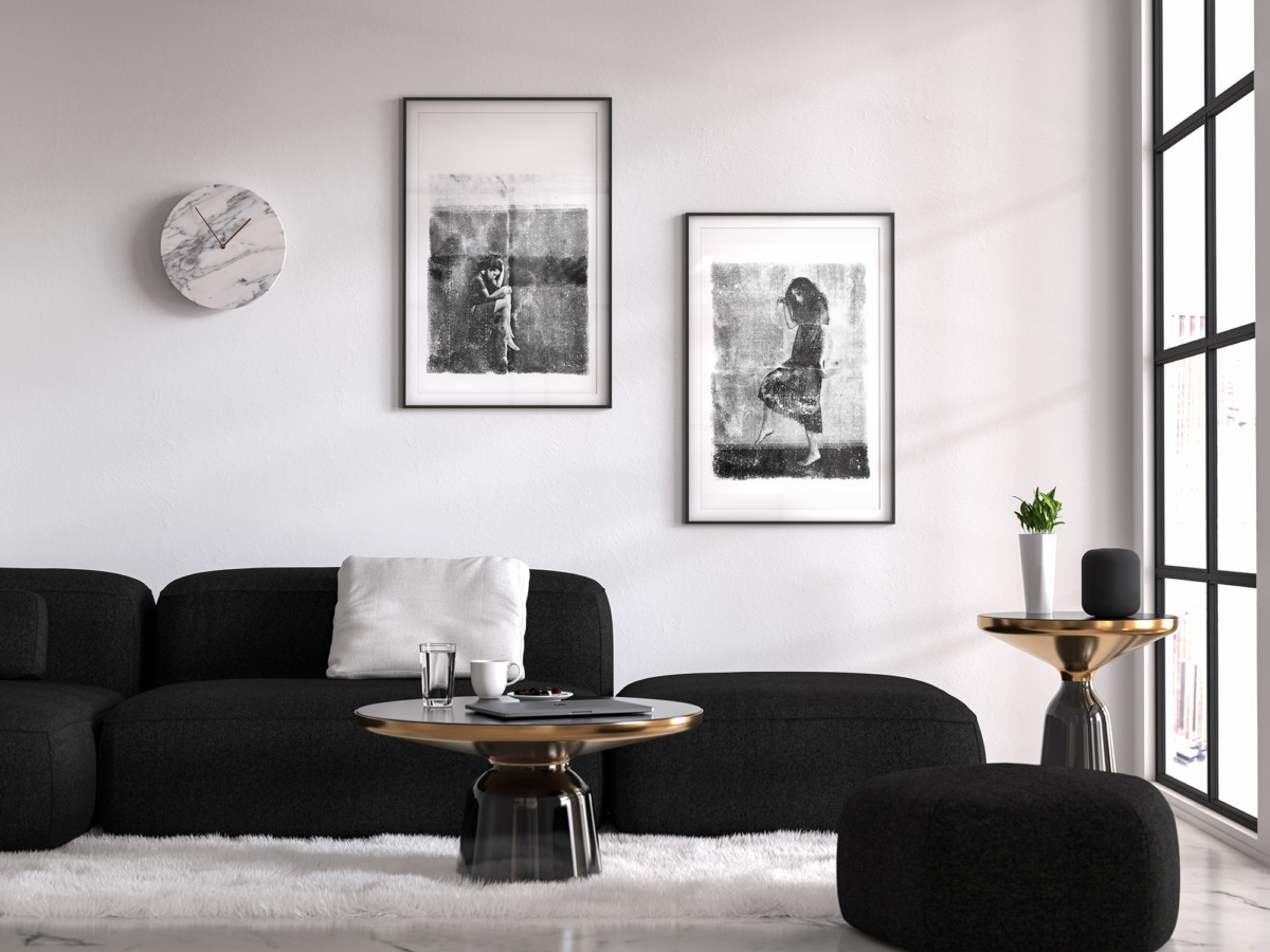 Najczęściej wystarczy białe passepartout i prosta w formie rama, aby dwuwymiarowy obiekt cechował się pożądaną prostotą. Czerń i biel doskonale odnajduje się też w towarzystwie drewna, miedzi czy betonu. Biała praca o połyskliwej powierzchni będzie odbijać światło niczym lustro, co sprawdzi się w niedoświetlonym dziennym światłem pomieszczeniu. Z kolei prace z przeważającym czarnym odcieniem to doskonałe rozwiązanie dla pokojów wysokich i przestrzennych. Małoformatowe obrazki mogą posłużyć za doskonały moduł. Czerń, biel i szarość nie musi przecież pojawiać się tylko i wyłącznie w ramach. Taką możliwość, jak żadna inna technika daje właśnie grafika i technologia druku. Dzięki niej można stworzyć nieograniczoną liczbę rodzajów wydruków i egzemplarzy (choć profesjonalni artyści tworzą raczej określoną ilość prac i odpowiednio je sygnują). Ogromnym plusem takiego rozwiązania jest możliwość wcześniejszego ustalenia z autorem w jakiej formie dzieło sztuki ma funkcjonować w konkretnym miejscu.