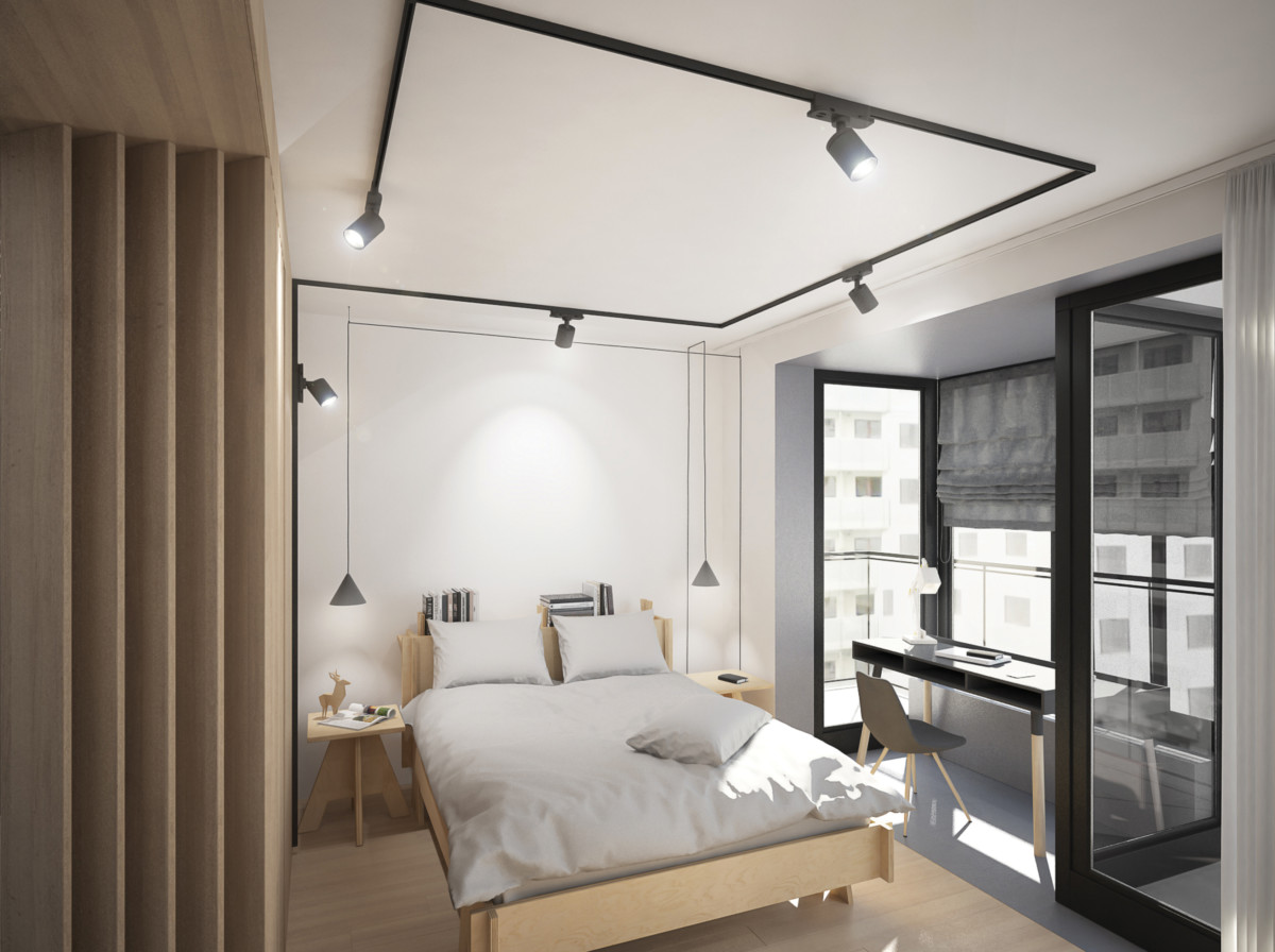 W sypialni zaprojektowano również szarą wnękę przy oknach, która stanowi nowoczesne miejsce do pracy. Oświetlenie zostało umieszczone na ciemnych szynoprzewodach, które podkreślają kształt sufitu i zapewniają mobilność oświetlenia. Dzięki niemu, światło może być skierowane na sekretarzyk, łózko, szafy lub inny element pomieszczenia.