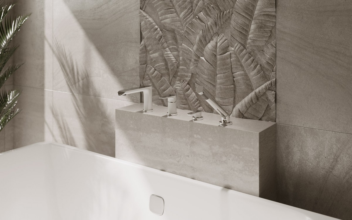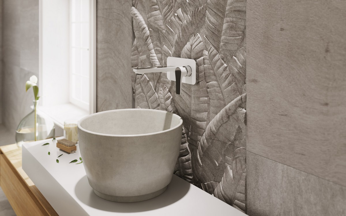 We wnętrzu pełnym naturalnych akcentów nie może zabraknąć także sprzętów z eleganckiego kamienia, które świetnie sprawdzają się w strefie umywalki. Podłużny kamienny blat i okrągła, głęboka umywalka wyglądają imponująco, zwłaszcza gdy towarzyszy im oryginalna bateria umywalkowa podtynkowa z wylewką o długości 190 mm z luksusowej kolekcji Adore. W tak zaaranżowanej przestrzeni dobrze zaprezentuje się duże lustro o prostej, minimalistycznej formie, które idealnie współgra zarówno z dekoracyjną armaturą, jak i drewnianą szafką na ręczniki i inne łazienkowe gadżety. Jeszcze tylko ładny kwiat w szklanym wazonie i strefa stanie się niezwykle przytulna.