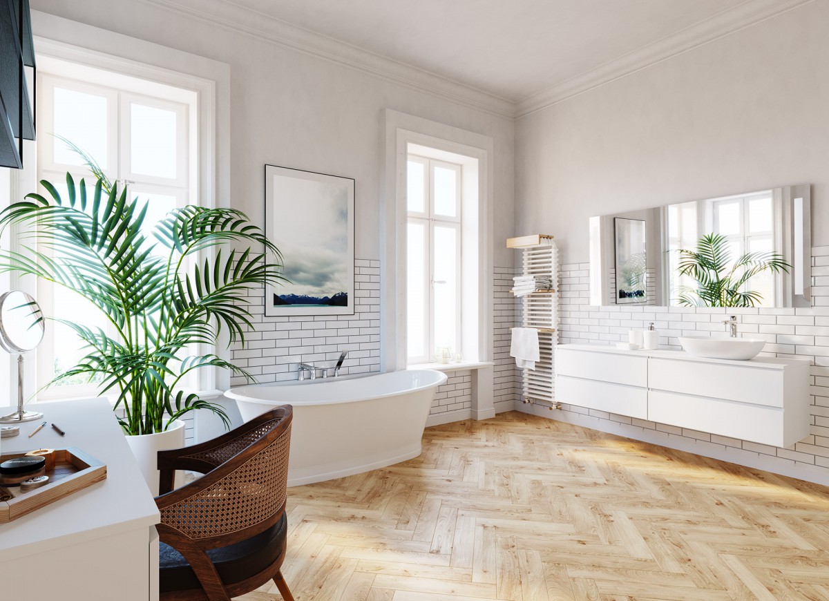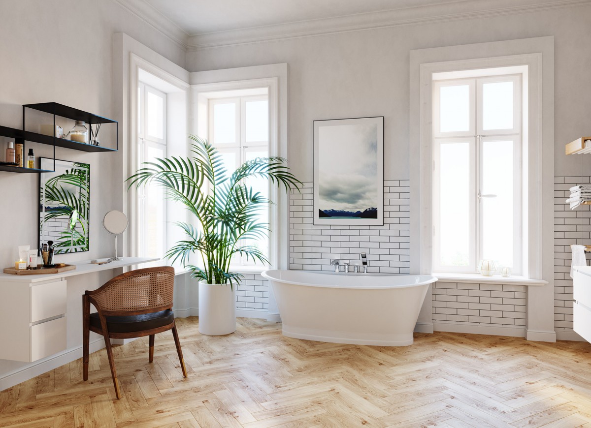 Istotne jest znalezienie właściwej okładziny ścian i podłóg. Tu najczęściej warto sięgnąć po elementy stylizowane. Z pewnością odpowiednie będą płytki typu subway. Nie dość, że historycznie nawiązują do przełomu XIX i XX wieku, to dodatkowo od kilku sezonów są prawdziwym hitem zarówno jeśli chodzi o łazienki, jak i kuchnie. Najczęściej wybieraną w tego typu łazienkowych stylizacjach biel płytek, warto przełamać ciepłą barwą naturalnego drewna. W takim przypadku można postawić – o ile pozwoli na to jego stan – na oryginalny parkiet. Odnowiony i dobrze zabezpieczony z pewnością posłuży nam jeszcze wiele lat.
