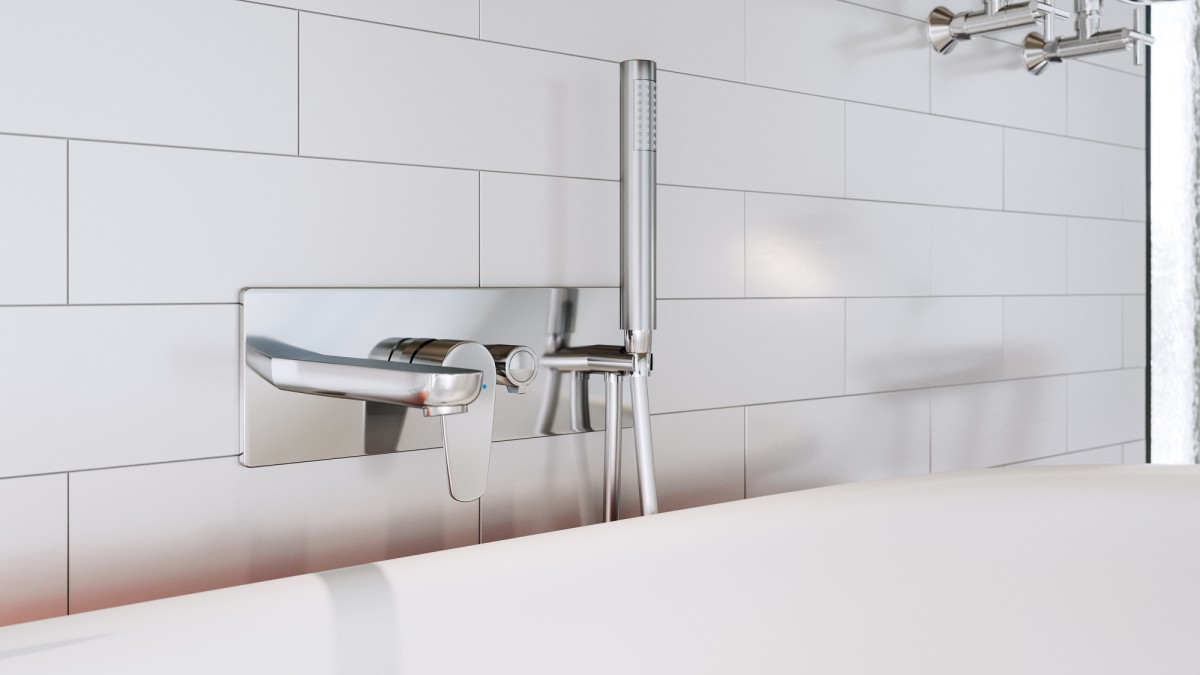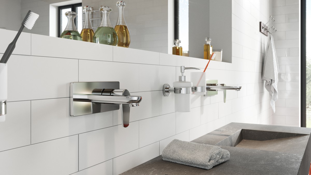 Do aranżacji wybrano baterie podtynkowe ALGEO marki Ferro. Ich minimalistyczna forma świetnie harmonizuje z industrialem. To eleganckie, a zarazem funkcjonalne modele, które nie zajmują wiele miejsca, gdyż na ścianie widoczne są tylko prostokątne płytki z częściami sterującymi. W przypadku baterii wannowej są to: płaska wylewka o długości 19 cm, podłużna opływowa rączka natrysku punktowego, ceramiczny przełącznik wanna/natrysk oraz uchwyt. Bateria umywalkowa posiada 18-centymetrową wylewkę. W obydwu modelach zamontowano perlator napowietrzający strumień wody, dzięki czemu korzystamy z niej oszczędniej. Baterie zostały wyposażone w regulatory ceramiczne. Z armaturą korespondują łazienkowe akcesoria z linii GRACE, jak szklanki na szczoteczki czy dozownik na mydło – wykonane ze szkła, chromowane, estetyczne.