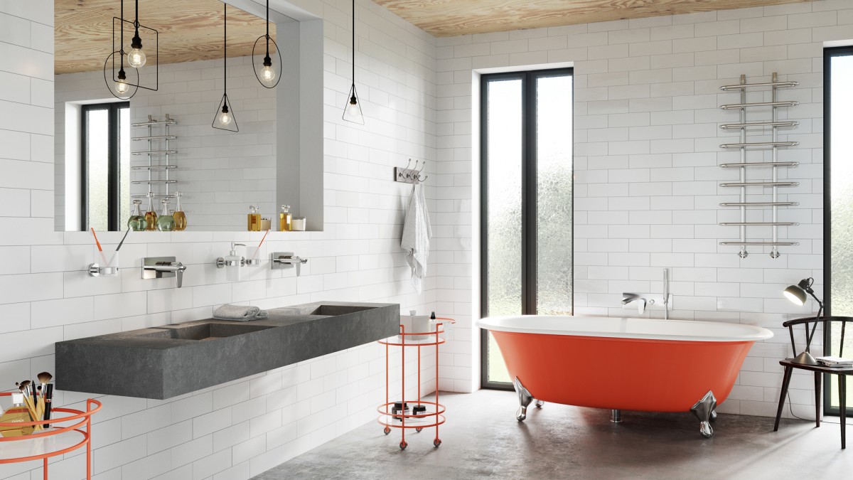 Typowa dla loftu surowość kompozycji została złagodzona drewnianym sufitem. Wizualny chłód najmocniej przełamuje jednak intensywna, ceglana barwa wolnostojącej wanny i minimalistycznych, okrągłych półek na kółkach. Oranż, przywołujący skojarzenia nie tylko z naturalną cegłą, ale i ze znakami ostrzegawczymi w hali fabrycznej, wprowadza niespotykaną dynamikę, ożywia stylizację. Bez wątpienia wywołuje efekt zaskoczenia u osoby wchodzącej po raz pierwszy do tej łazienki.