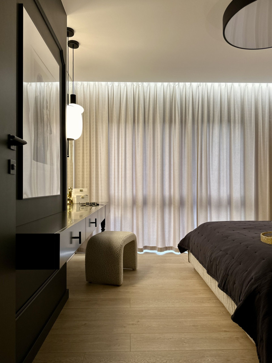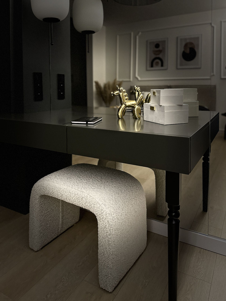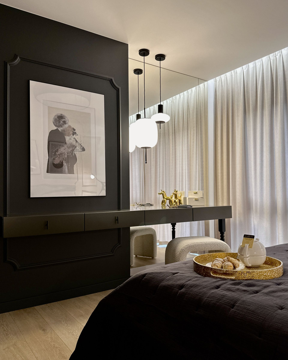 W sypialni postawiono na wyrafinowany luksus w minimalistycznym wydaniu. Duże łóżko dla dwojga, ogromne lustro i elegancka toaletka tworzą niewielką przestrzeń do wypoczynku i twórczej pracy w domowym biurze.