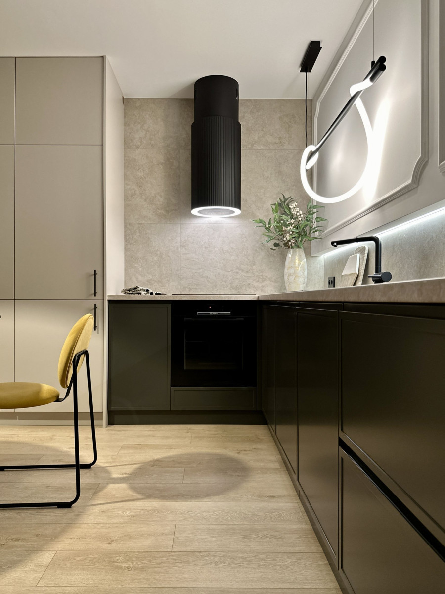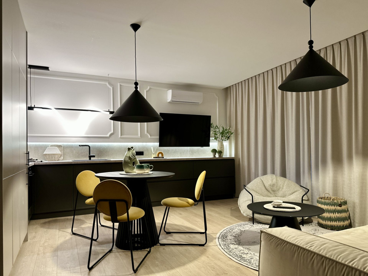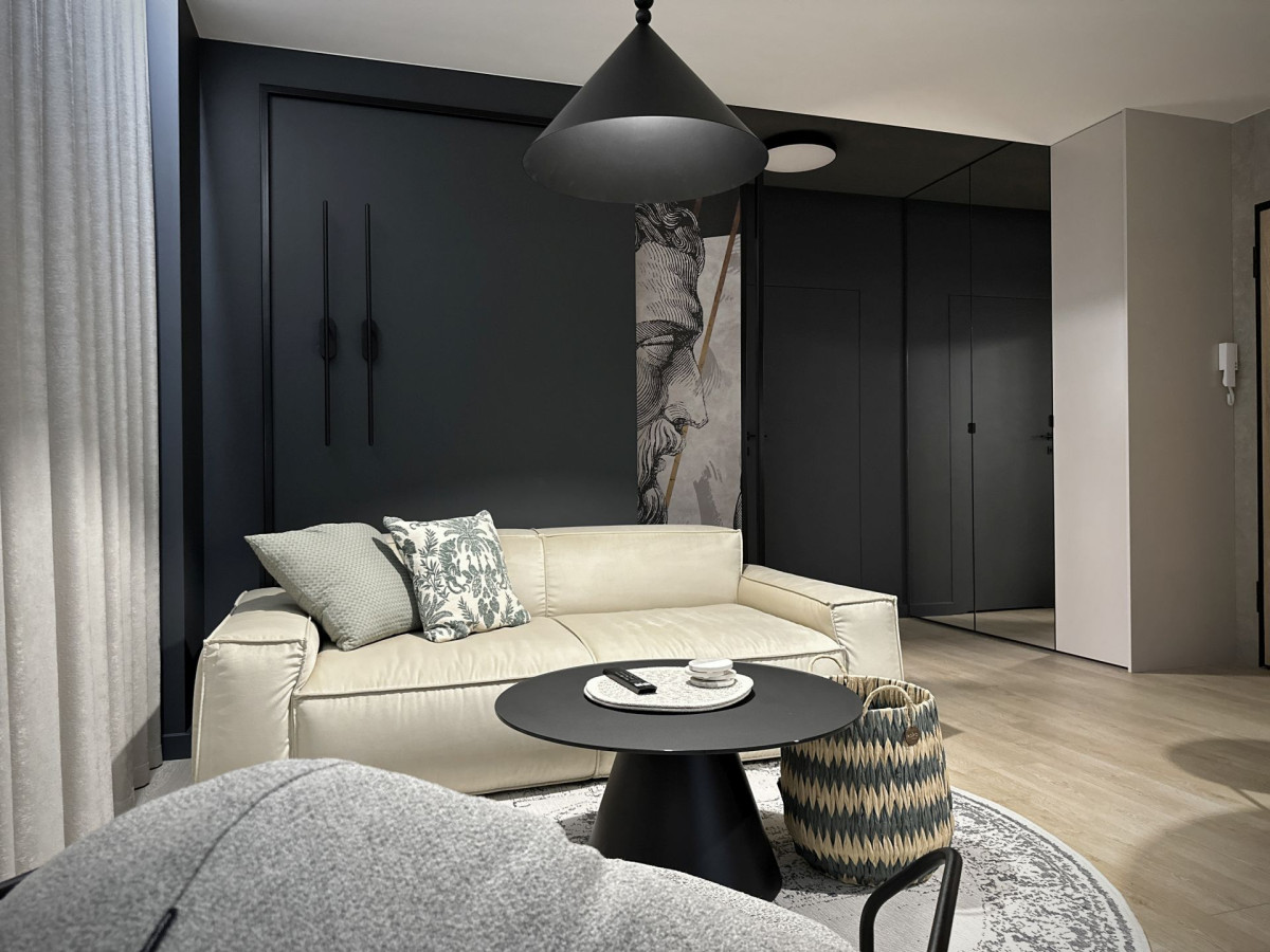Jedna z ostatnich realizacji pracowni KOiKO Design, to 48-metrowe mieszkanie do wynajęcia, zlokalizowane w jednej z atrakcyjniejszych dzielnic Dąbrowy Górniczej, na osiedlu Nowa Dąbrowa. Inwestycja charakteryzuje się wysokim standardem, co zasadniczo zdeterminowało zarówno wybór stylu wnętrza, jak i wyposażenia. Przemyślane podejście do zastanej przestrzeni i staranność projektantek, sprawiły, że pomimo niewielkiego metrażu, apartament jest kuszącą propozycją dla potencjalnych najemców. Kontrast jasnych i ciemnych elementów dodaje nie tylko głębi, ale i charakteru, ukazując potencjał głębokich barw w zacieraniu granic i udowadniając, że ciemne kolory niekoniecznie zmniejszają pomieszczenia.