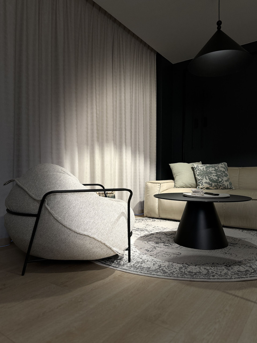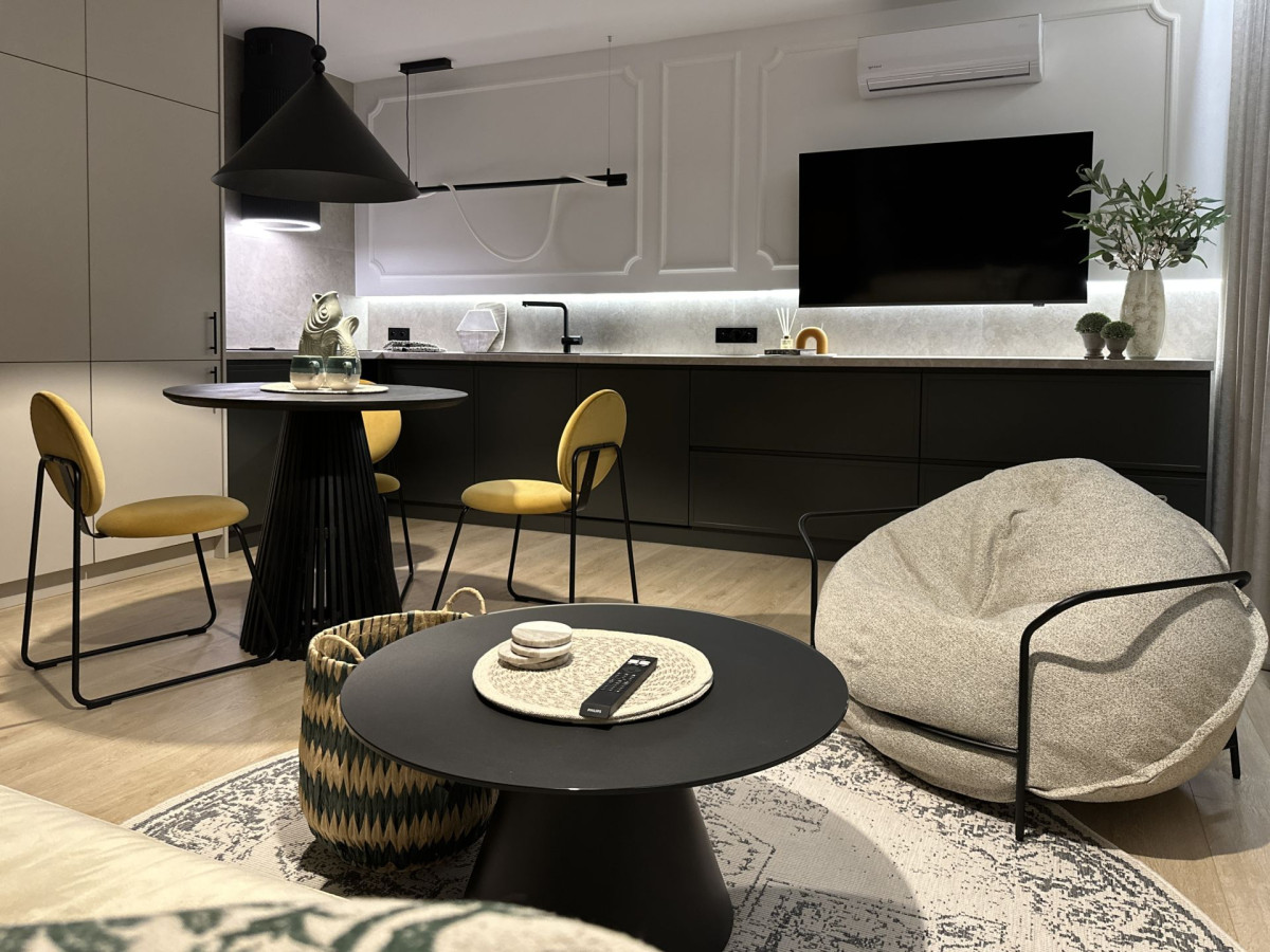 Wiodącymi elementami kompozycji wnętrz są grafit, biel oraz odważne wykorzystanie drewna, szczególnie w kontekście intensywnego koloru grafitowego. Projektantki zdecydowały się na subtelne, ale strategiczne użycie kolorów, przy czym grafit zrównoważono delikatnymi akcentami odcieni mebli, tapicerki i zasłon. Wprowadzając akcenty kolorystyczne, projektantki miały na uwadze różnorodność gustów przyszłych najemców. Stąd decyzja o ograniczeniu barwnych elementów do subtelnych dodatków w postaci zieleni i miodu, które stopniowo przechodzą w złote akcenty. Świadoma kompozycja pozwala na stworzenie przestrzeni, którą łatwo dostosować do preferencji wynajmujących, poprzez proste zmiany wyposażenia, takie jak wymiana krzeseł czy poduszek dekoracyjnych.