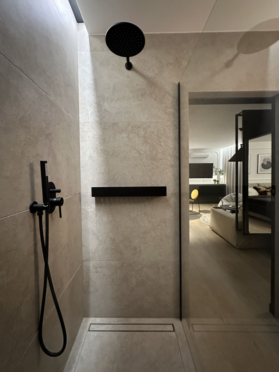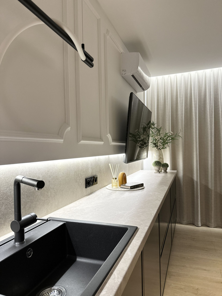 Zespół KOiKO Design zadbał o elastyczność tej 48-metrowej przestrzeni, umożliwiając łatwą personalizację przy minimalnym nakładzie finansowym. Dzięki temu, akcenty w postaci miodu i złota doskonale komponują się z tonacją podłogi, tworząc neutralne tło, które nie narzuca konkretnego stylu, pozostawiając przyszłym mieszkańcom pełną swobodę w eksperymentowaniu z wnętrzem.