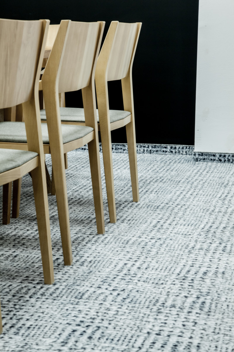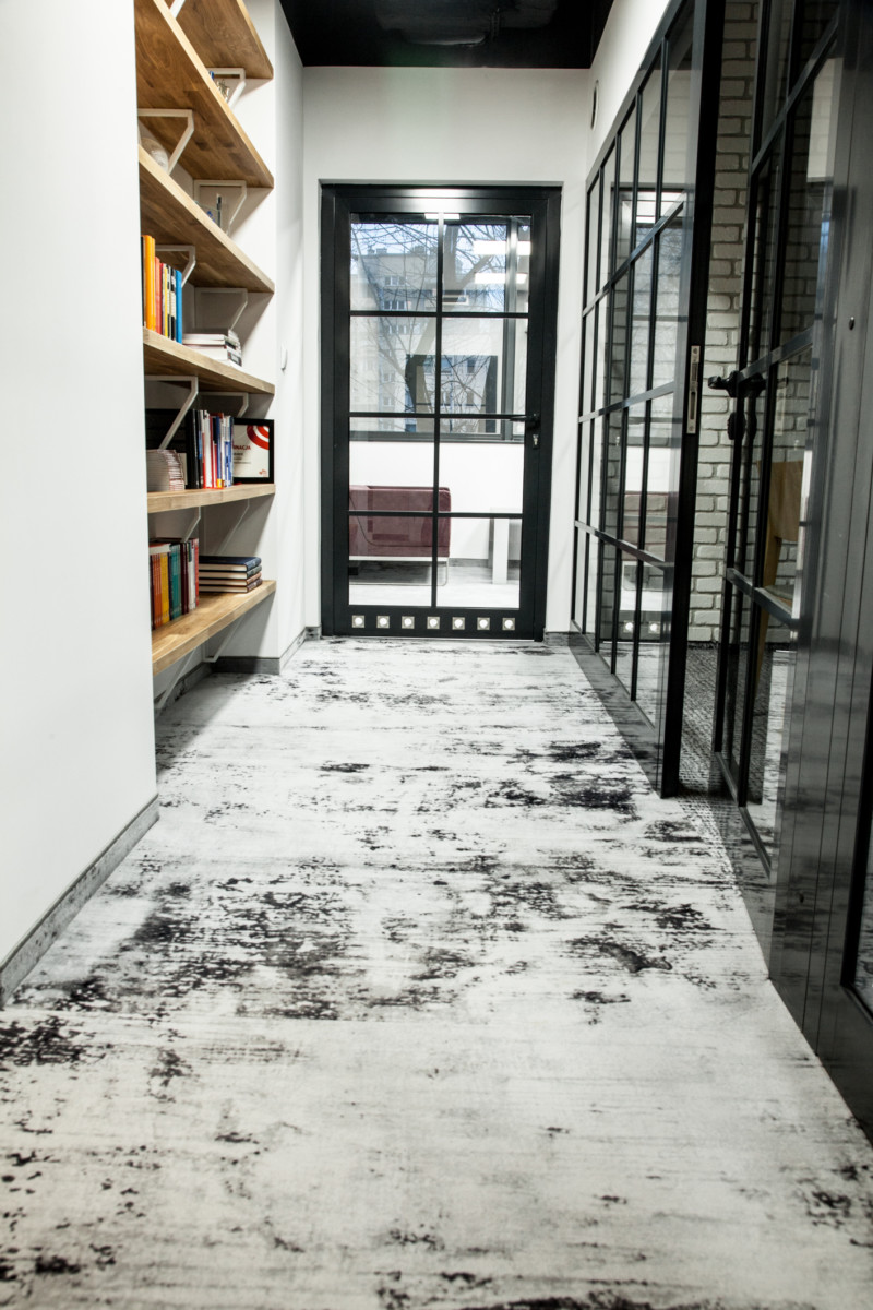 Oryginalnym zabiegiem, wykorzystanym podczas aranżacji biura, są efektowne wykładziny Newmor Polska, z ocieplającym wnętrze wzorem wełnianych warkoczy. Przyznacie, że rzadko widujemy w pracy tak przyjemną dla oka podłogę, która przypomina wzorem… zimowy sweter. Poza oczywistym efektem przytulności, wykładziny Halbmond z serii Cozy Moments wniosły do wnętrz krakowskiego biura atmosferę, dzięki której wszyscy czują się tam jak w domu. Na podłodze znajdziemy także wykładzinę dywanową Halbmond Vintage, z delikatnym wzorem przypominającym padający śnieg – tłem subtelnie podkreślającym miejsce pracy ludzi, którzy fascynację modą zmienili w sposób na życie.