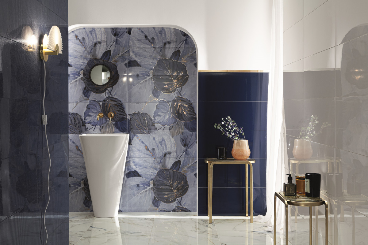 Kolekcja ma dwie odsłony, które łączy złoto. Pierwsza bazuje na motywie roślinnym. Okazałe liście powleczone błękitami, bielą i granatami, zostały przystrojone efemerycznymi muśnięciami złota w konturach wzoru. Dzięki temu płytki tworzą prawdziwe dzieło sztuki. Z kolei druga propozycja to przepiękne, pokryte złotą warstewką płytki w kolorze nasyconego burgundu oraz głębokiego granatu. Silny kontrast tonują subtelne złocenia, które wyglądają niczym skrzące się w blasku słońca krople rosy.