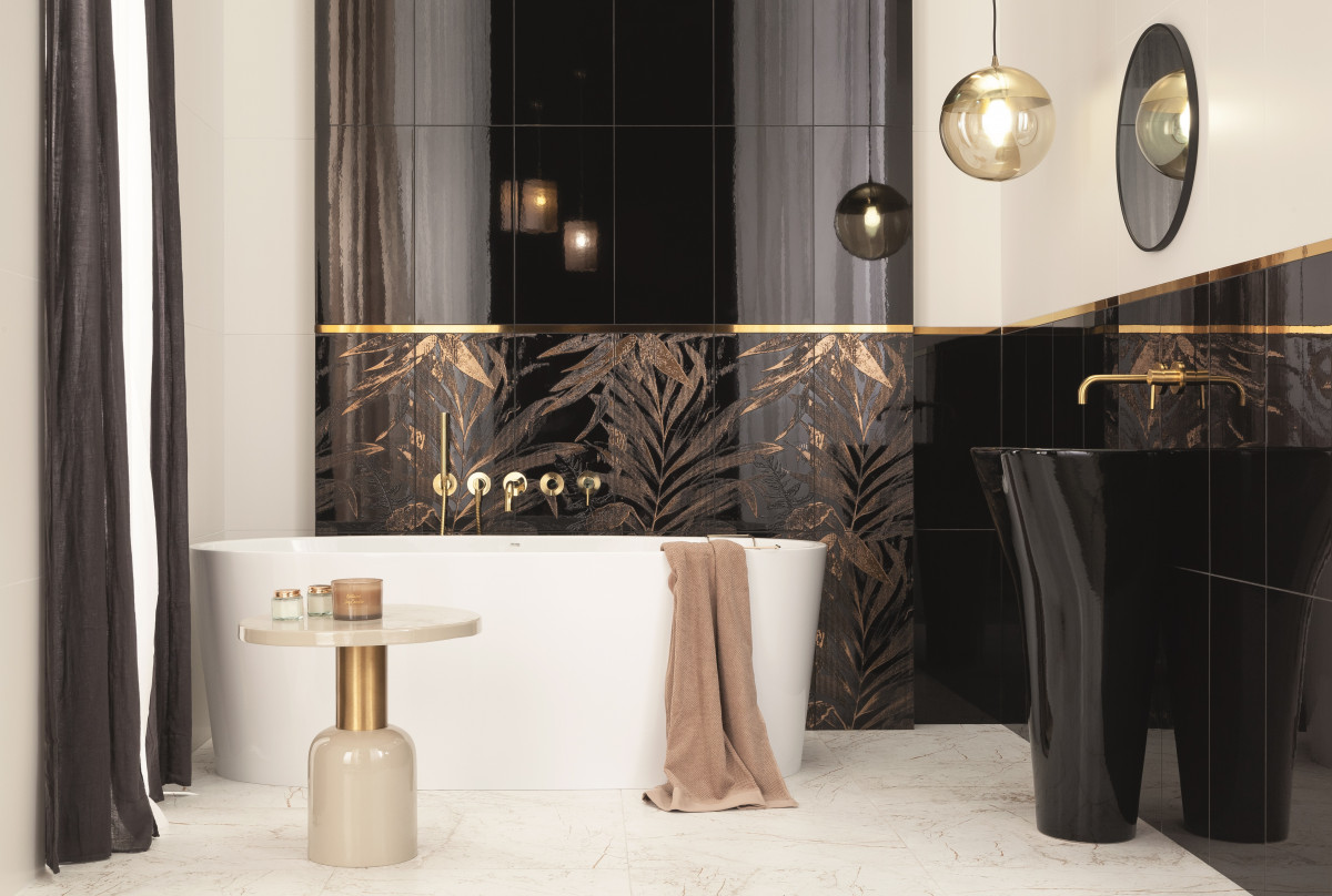 Złoto i miedź to szlachetne kolory, które potrafią wnieść do wnętrza blichtr i nutę orzeźwienia. Nie warto z nich rezygnować, choćby dlatego, że doskonale komponują się z większością barw i odcieni, podbijając ich głębię. Złoto szczególnie zjawiskowo prezentuje się z czernią, intensywnymi brązami oraz miedzianymi refleksami, podobnie jak w kolekcji Sophi Oro od Grupy Tubądzin. Klasyczna czerń posłużyła tu za tło dla wytłaczanych złotem palmowych liści. Motyw roślinny wprowadza pierwiastek egzotyki oraz oryginalności. Płytki Sophi Oro zadają szyku i zadbają o to, aby domowe przestrzenie zachwycały wyważonym karnawałowym sznytem przez cały rok!