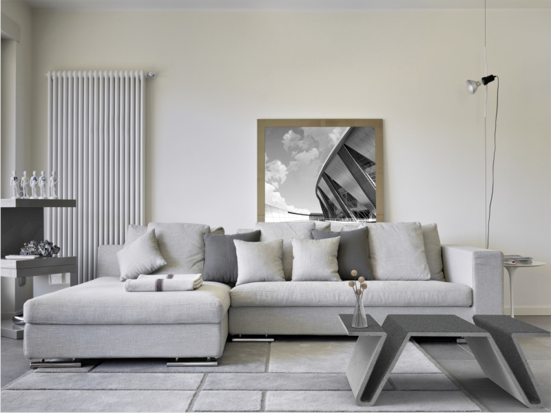 Wybór wyposażenia do nowoczesnych salonów również odzwierciedla dążenie do minimalizmu. Stosujemy w nich meble o prostej formie i geometrycznych kształtach, pozbawione zdobień. Im w pomieszczeniu mniej mebli tym lepiej. Zdecydowanie najważniejsze z nich to sofa i stolik kawowy. Ten ostatni – nierzadko jako jedyny mebel w pomieszczeniu – posiada fantazyjny kształt czy wyrazisty kolor, stając się w harmonijnej i wyważonej przestrzeni elementem dynamizującym i ożywiającym. Dobrym rozwiązaniem jest postawienie na jeden wyrazisty element czy charakterystyczny detal. W tej roli świetnie sprawdzą się np. lustro, stolik kawowy, podnóżek, lampa, obraz.