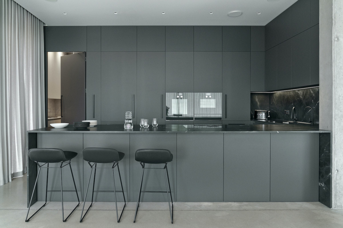 Wykonana na wymiar kuchnia pochodzi od marki ZAJC. Są to właściwie dwie kuchnie – reprezentacyjna i czysto techniczna, do której wejście prowadzi przez wysoką zabudowę meblową. Tę pierwszą, otwartą na salon i niezwykle elegancką, kształtuje antracytowy kolor frontów oraz blaty i część ścian wykończone matowym kwarcytem Negresco. Zachwyca on subtelnym i delikatnym wzorem jasnych żył na czarnym tle. Wprowadza odrobinę estetycznego zamieszania w tę minimalistyczną przestrzeń. Kuchnię uzupełnia duża wyspa umożliwiająca wspólne gotowanie czy spożywanie posiłków. Meble pokryte są specjalnym laminatem, dzięki któremu na powierzchniach nie pozostają ślady palców. Dominują tu odcienie szarości, czerni i bieli, które ociepla naturalne drewno i brązy sąsiadującego z kuchnią salonu. Z kolei kuchnia techniczna to typowo funkcjonalna przestrzeń służąca do zmywania naczyń i przechowywania żywności.