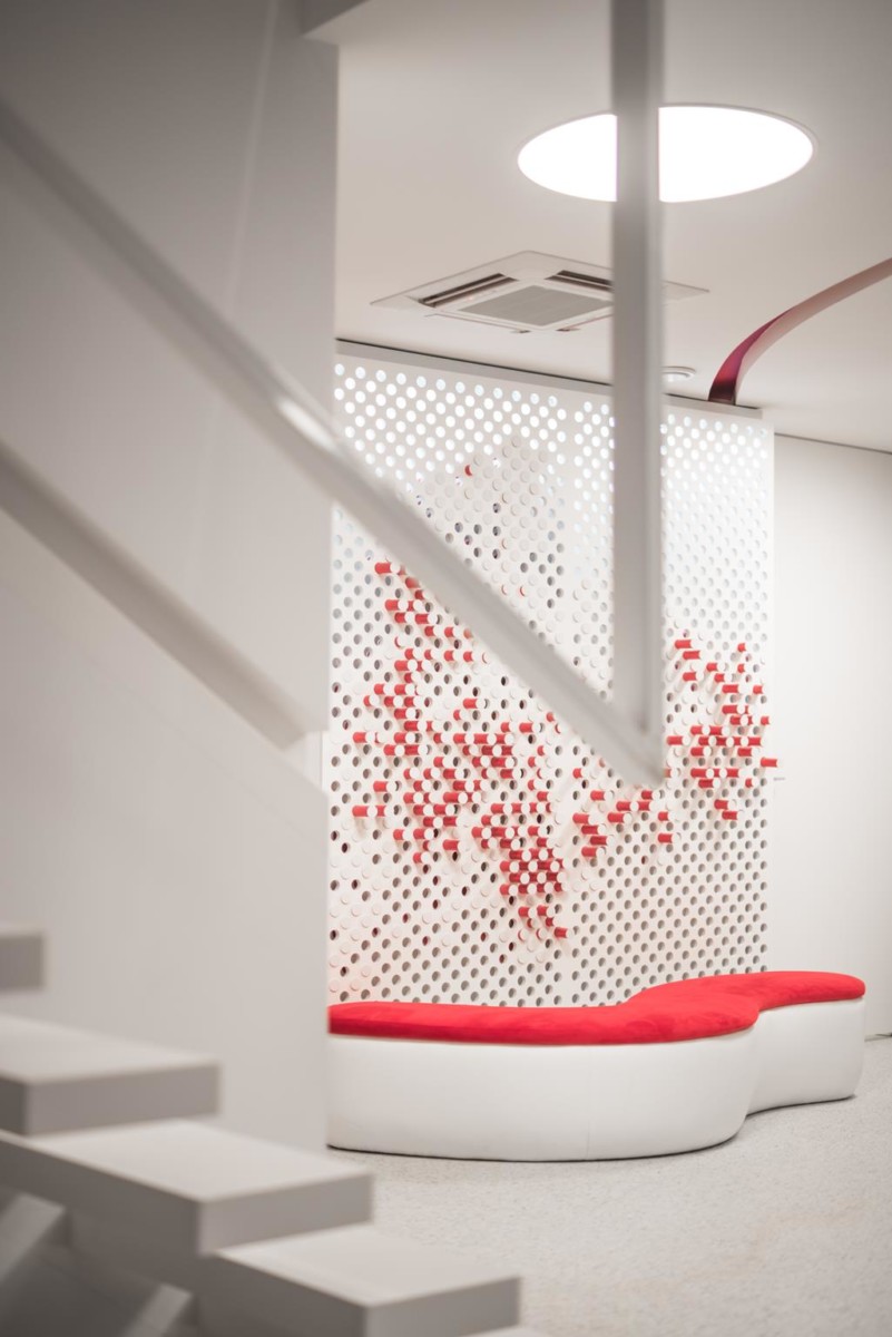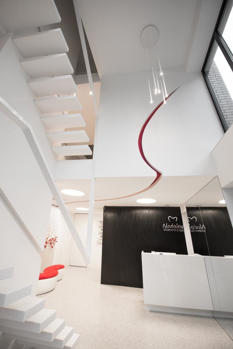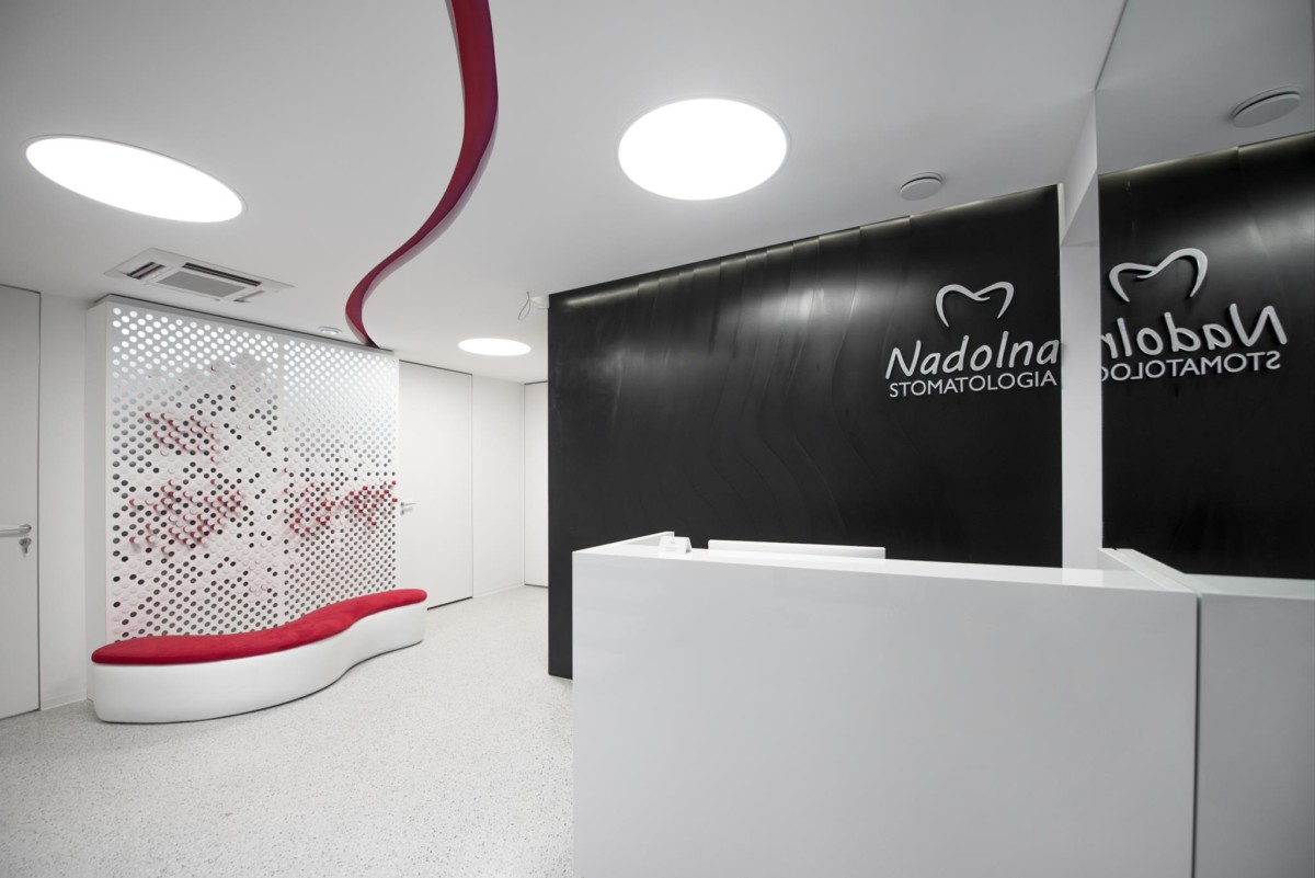 „Stomatologia Nadolna” ma w swojej specjalizacji stomatologię dziecięcą dlatego w poczekalni pojawił się kącik dla dzieci z wyjątkową ścianą, która zachęca najmłodszych do wciskania poszczególnych elementów. Ma im to pokazać, że kiedy pojawia się dziura w zębie – to pani stomatolog ją szybko wyleczy. Pufa to forma siedziska wykonana na indywidualne zamówienie nawiązująca do linii na suficie.