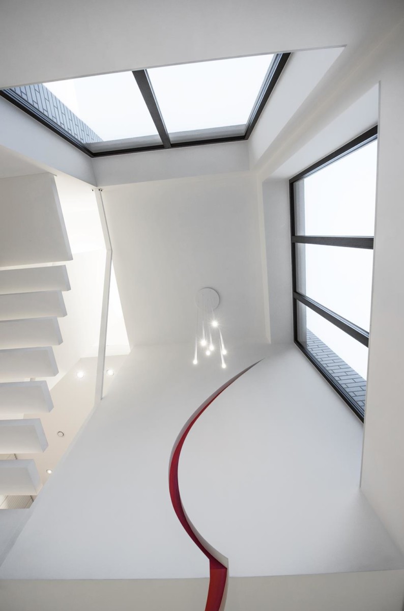 Uwagę od wejścia zwracają schody wykonane z kamienia, które wyglądają jakby były zawieszone w powietrzu. Pochwyt i poręcz to elementy lewitujące w całej przestrzeni – pochwyt daje wrażenie „wyrwanego ze ściany” i przeniesionego na drugą stronę schodów w formie poręczy „wypadającej” z sufitu.
