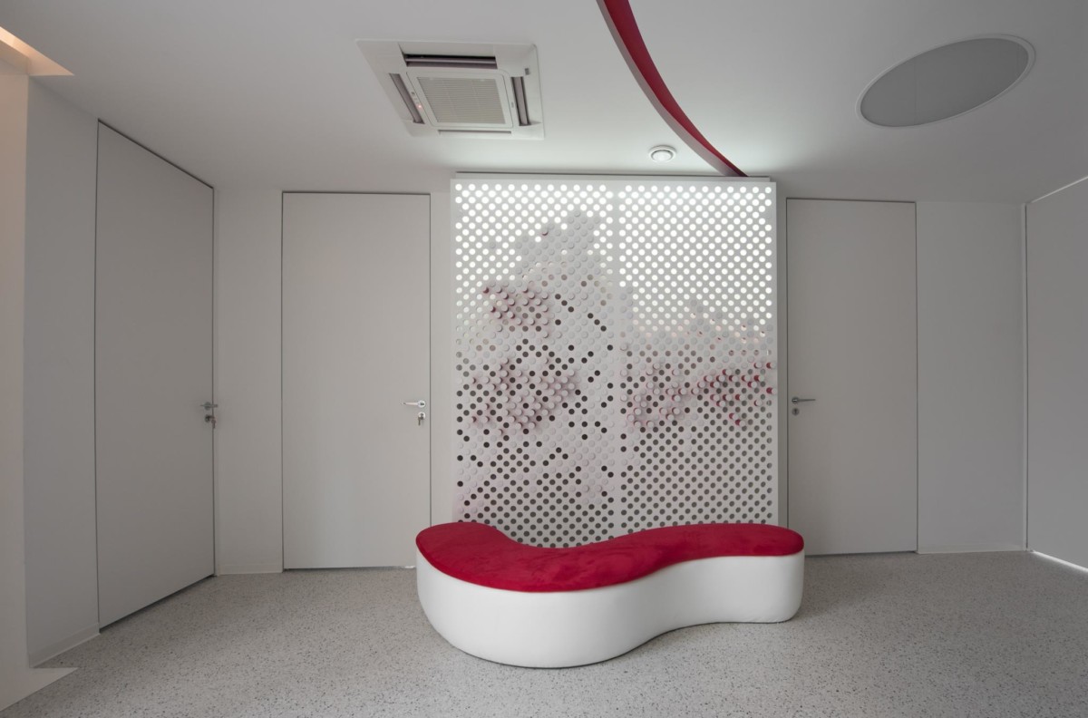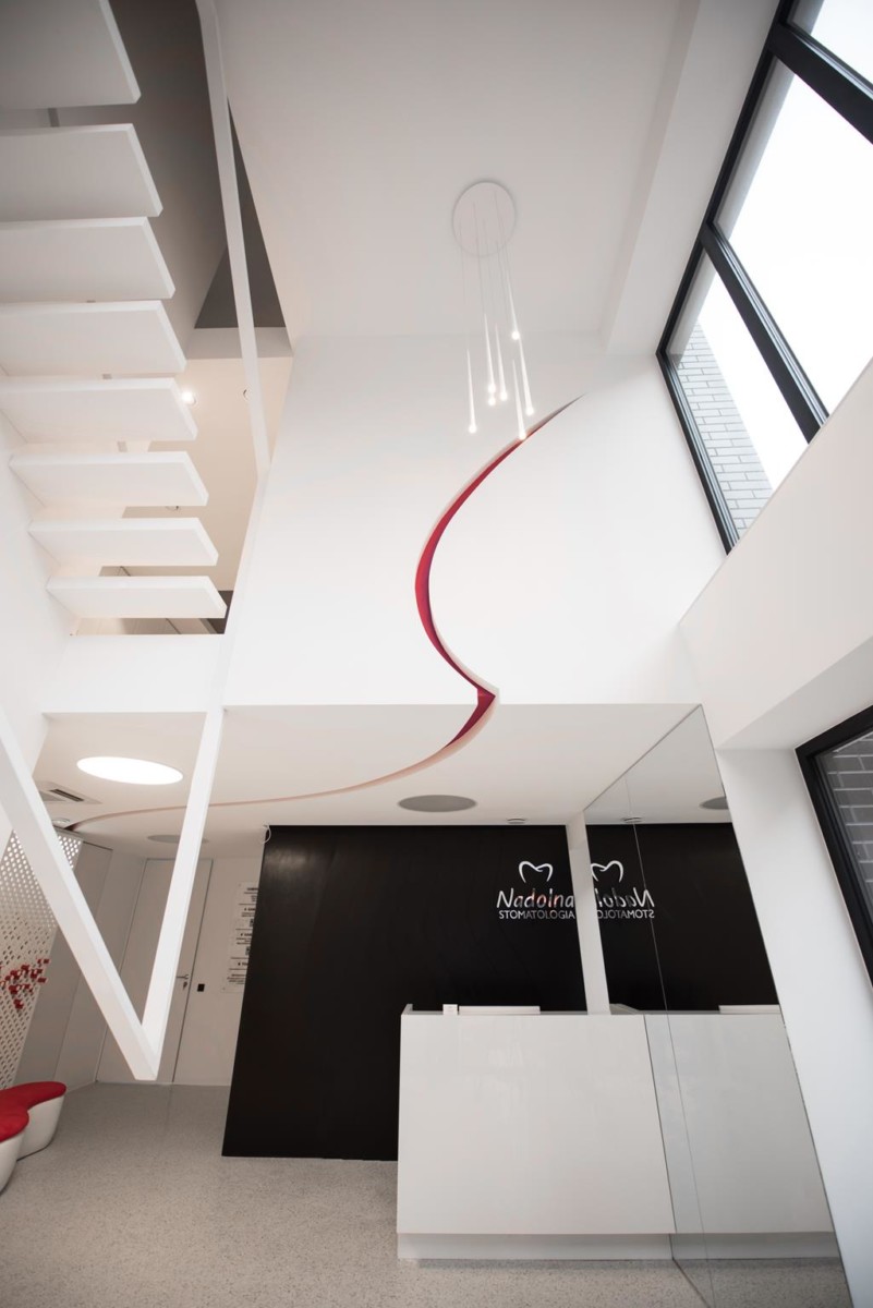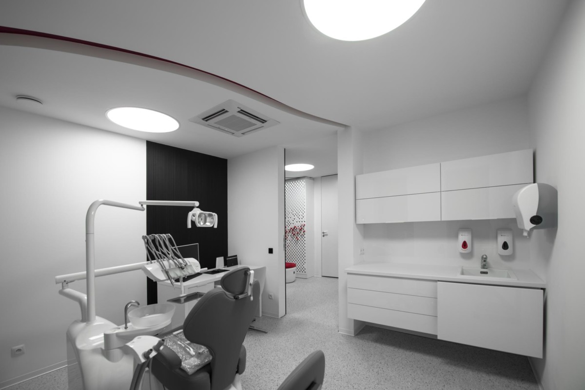 Inspiracją w projekcie była specyfika działalności gabinetu m.in. budowa jamy ustnej z uzębieniem. Elementy inspiracji widzimy w czarnej falującej ścianie na recepcji oraz w linii na suficie, która pojawia się w logo firmy. Prowadzi ona do poszczególnych gabinetów, a jednocześnie w całości tworzy kształt zęba, który widzimy również w logo. Kolorystyka – róż, fiolet, czerwień zaczerpnięta jest z identyfikacji wizualnej firmy, ale jednocześnie nawiązuje do kolorystyki występującej w jamie ustnej.