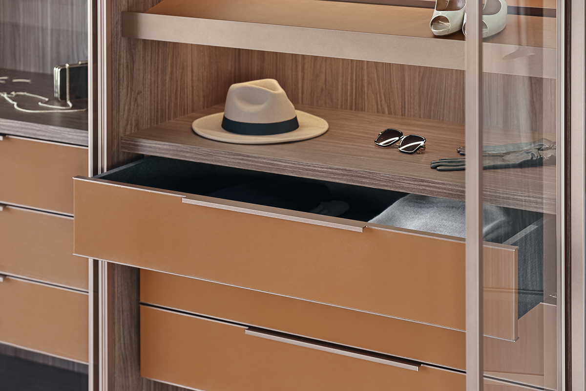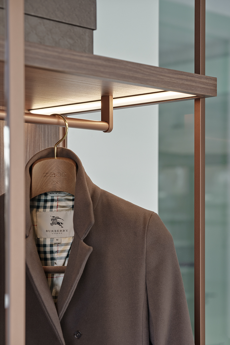 Luksusowy efekt całości zapewniają materiały oraz oświetlenie LED najnowszej generacji z ukrytymi, niewidocznymi źródłami, a zapewniającymi równomierną iluminację wnętrza. Ścianki garderoby pokryte są wysokiej jakości laminatem strukturalnym, który odwzorowuje najbardziej popularne gatunki drewna nie tylko pod kątem koloru i rysunku, ale również teksturalnym. W dotyku też nie różnią się od naturalnego materiału. Rama wykonana jest z aluminium – lekkiego, trwałego i odpornego metalu – i dostępna w szerokiej gamie kolorystycznej. Na przykład zgaszonej miedzi, która nadaje całości szlachetnego, matowego bliku. Elementy ozdobne, np. uchwyty szuflad wykonane są z miedzi.
