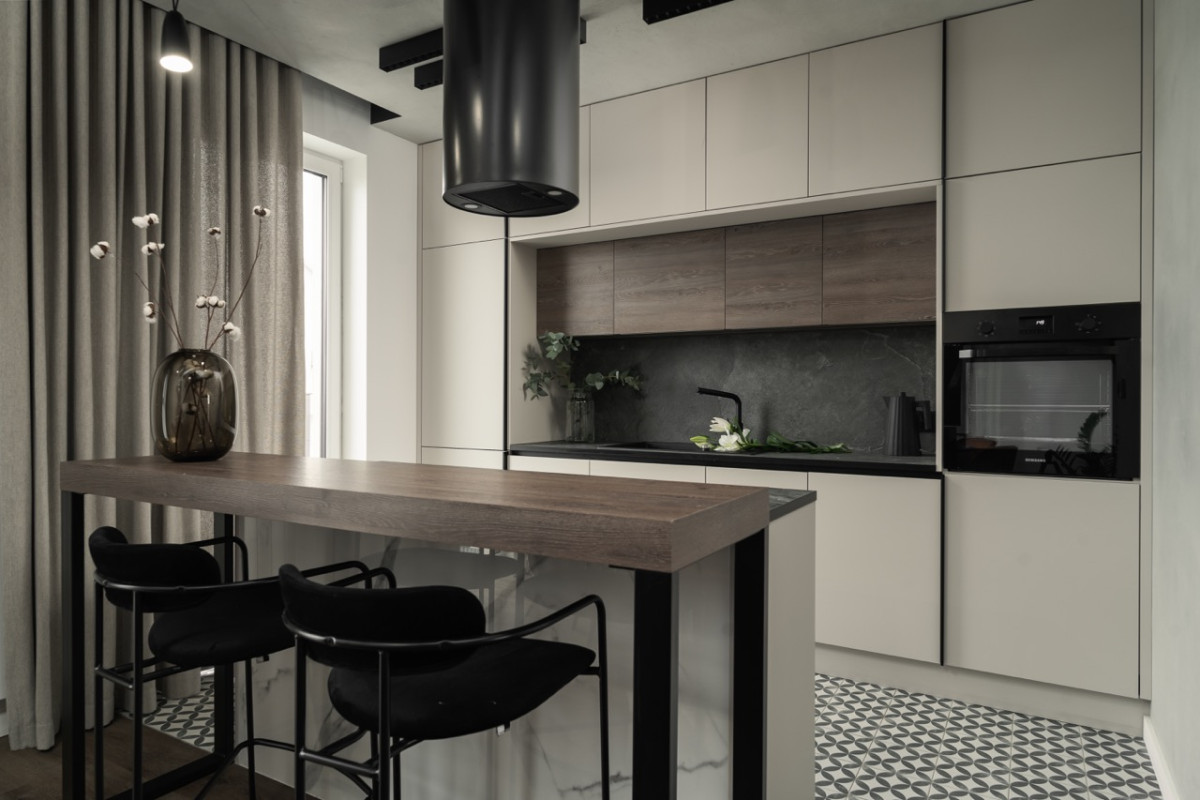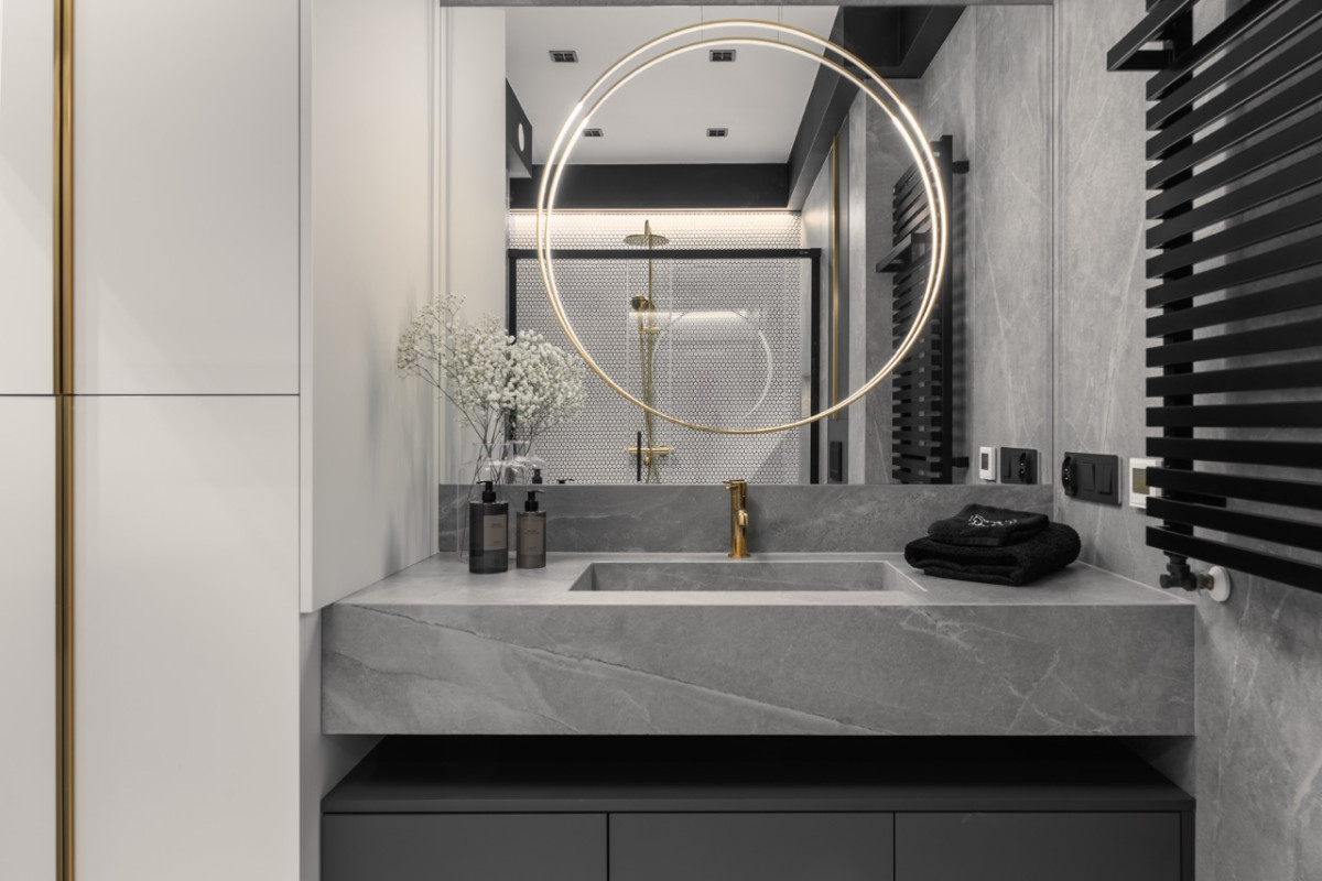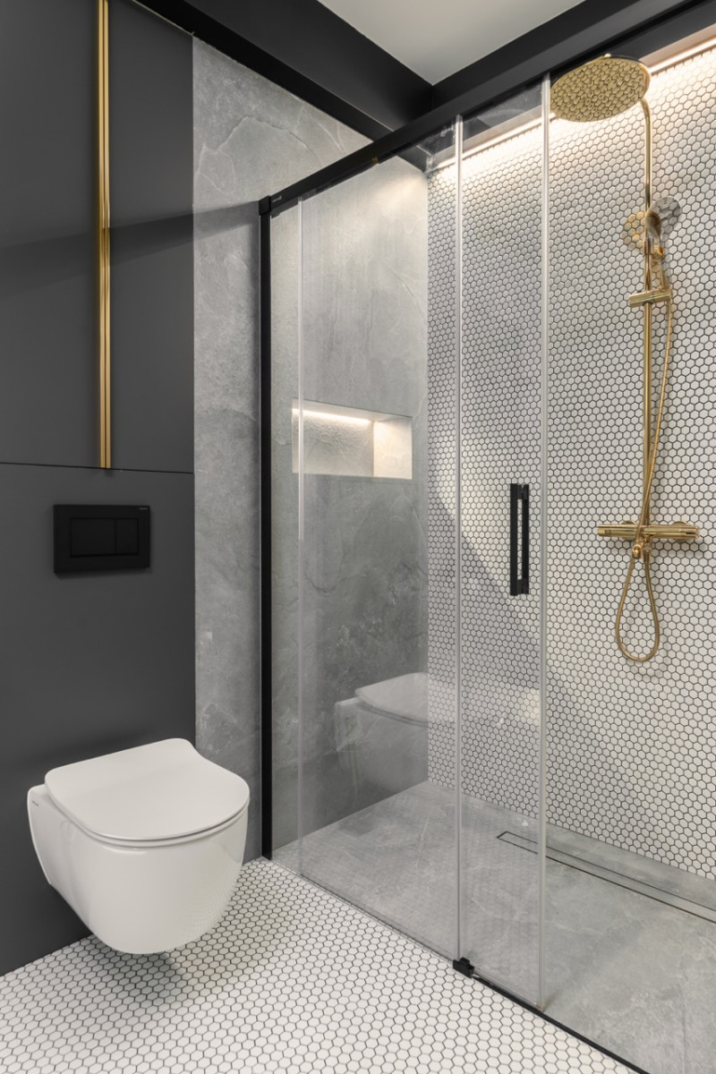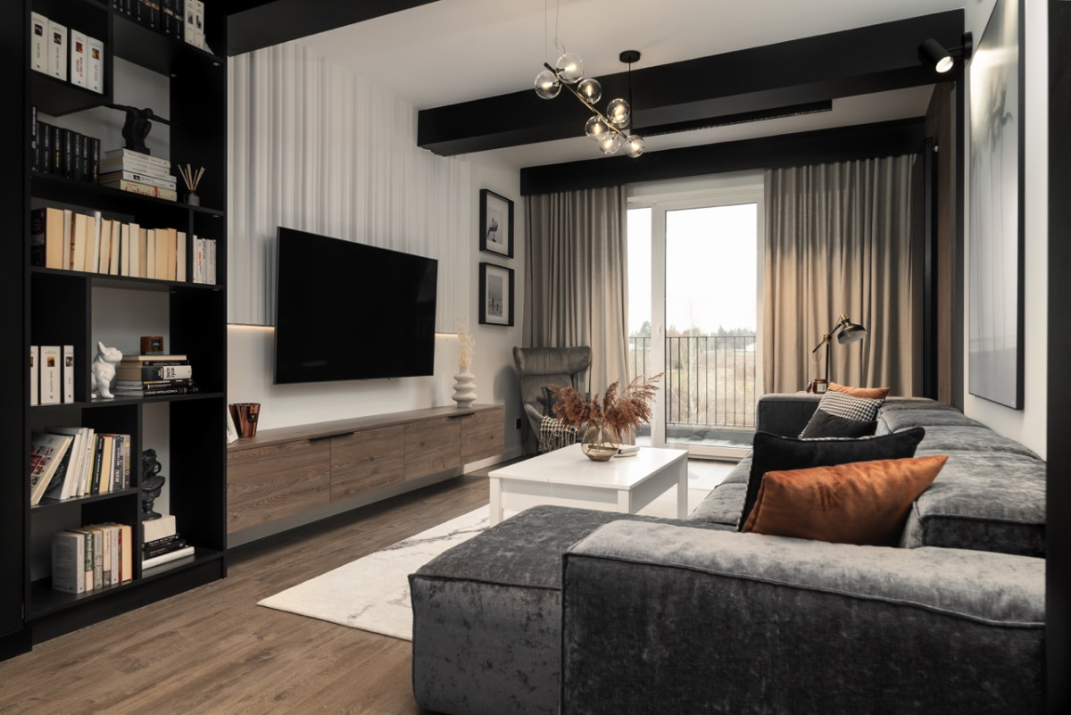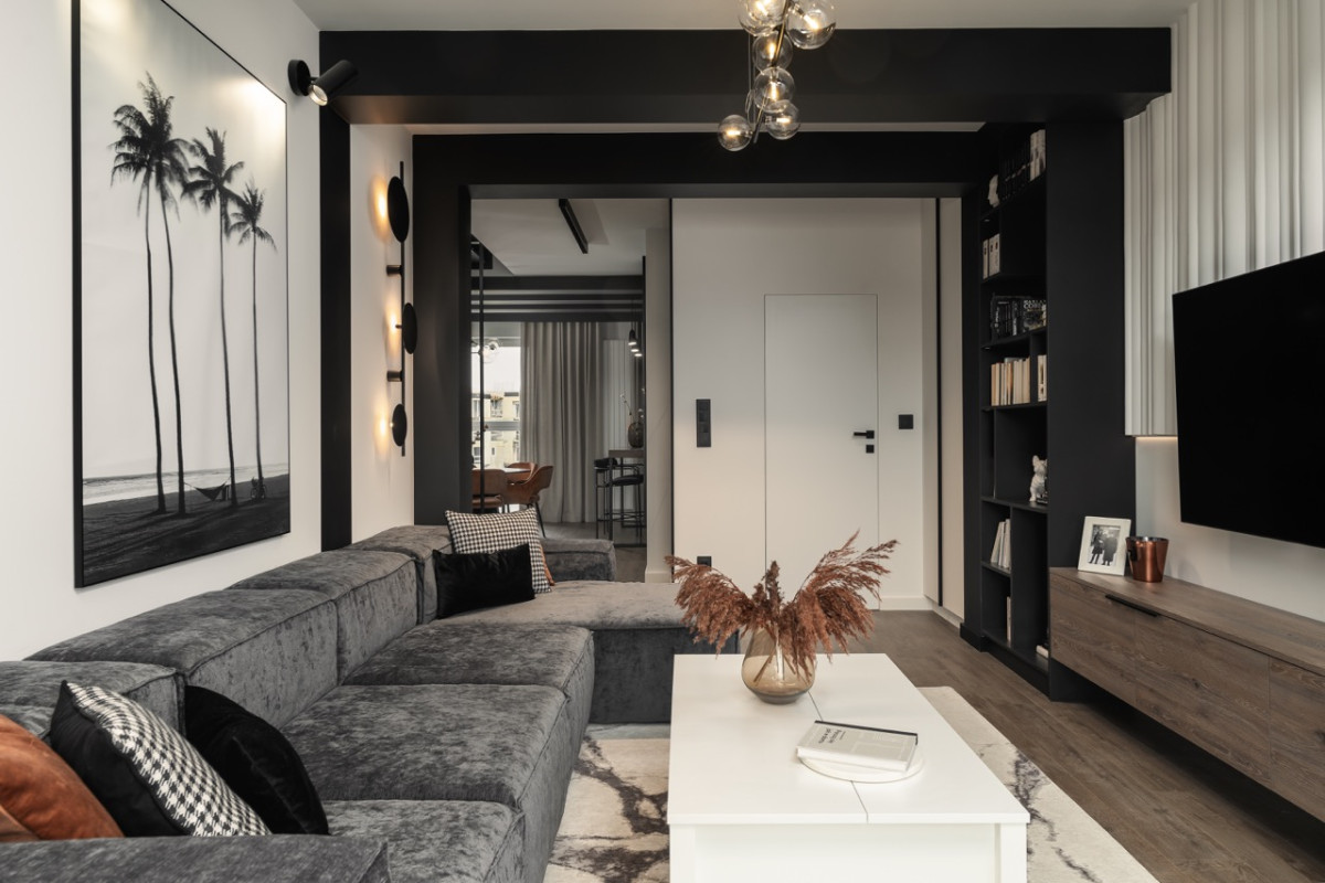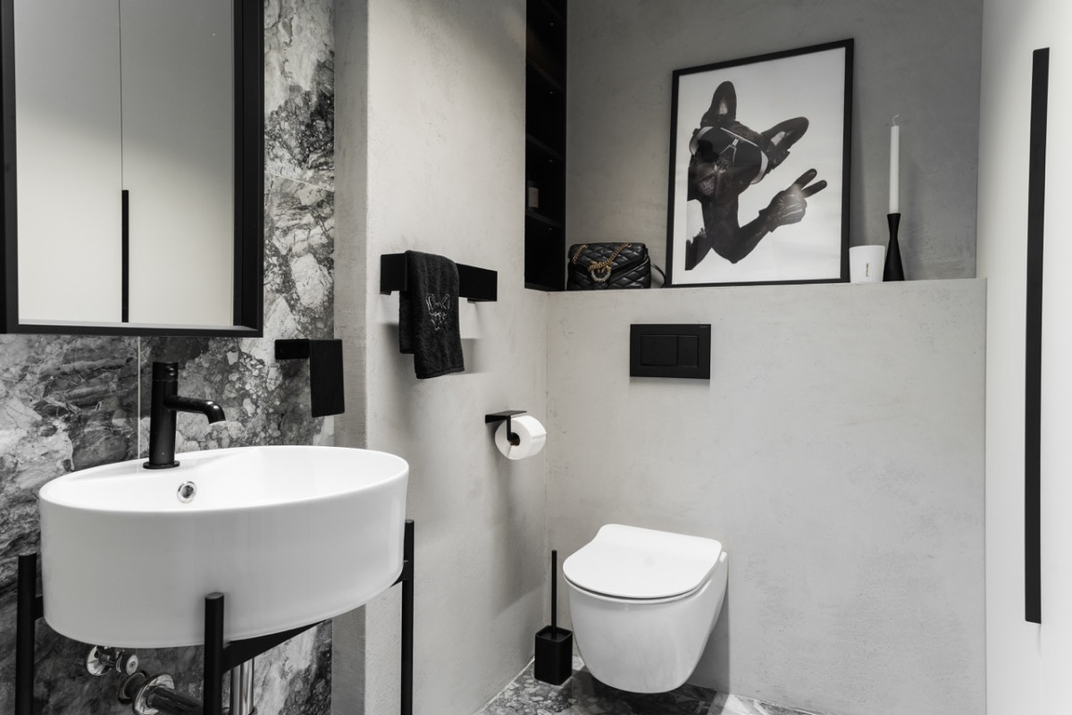 Dwukondygnacyjny apartament o powierzchni 73 mkw. wymagał całkowitej zmiany rozkładu pomieszczeń i ich funkcji. W stanie deweloperskim kuchnia z salonem była zaplanowana na wyższej kondygnacji, a pomieszczenia prywatne – na dole. Aby czuć się swobodnie już od wejścia, strefę dzienną przeniesiono na dół, otwierając wnętrze także na chętnie tu widzianych gości i przyjaciół. Wymagało to nie tylko wyburzenia ścian, ale też przeniesienia lokalizacji klatki schodowej. W efekcie uzyskano całkiem nowy – funkcjonalny i ergonomiczny podział przestrzeni, którą Sandra Białkowska urządziła z niezwykłą precyzją i starannością. Świadczą o tym zarówno wykonane wg autorskiego projektu zabudowy meblowe w kuchni czy salonie, jak i aranżacyjne detale, jak choćby osprzęt elektryczny z serii Simon 82 Detail marki Kontakt-Simon w czarnym kolorze, czy przyciski słupukujące z oferty Geberit, które doskonale wpisują się w koncepcję stylistyczną wnętrza. A ta zasługuje na szczególną uwagę.