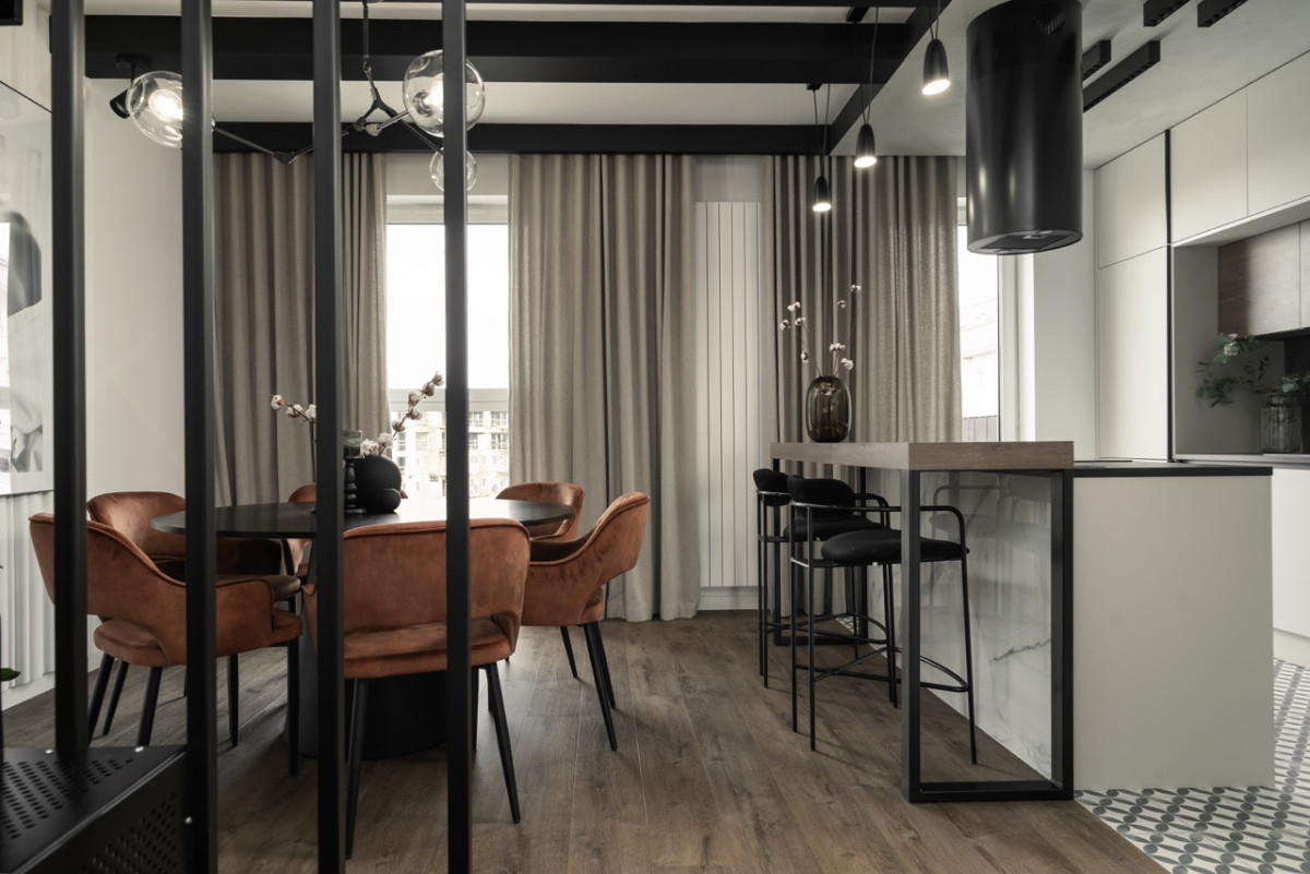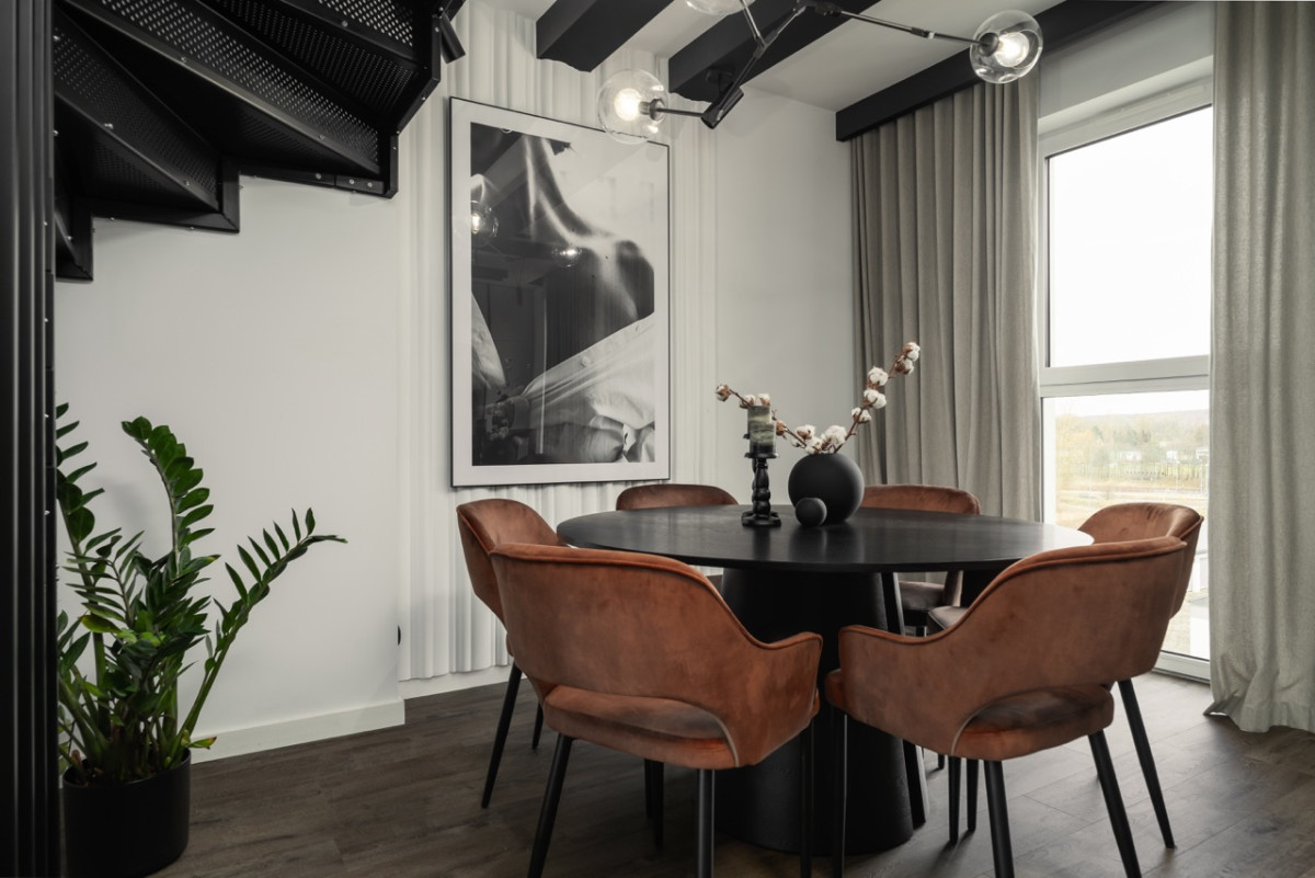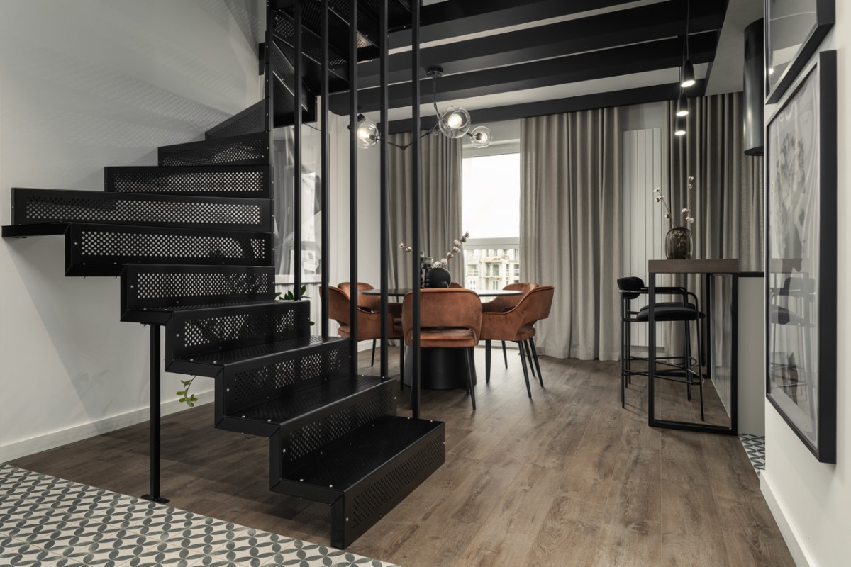 Już od progu wnętrza zachwycają ciepłą aurą i przytulnością, pomimo zdecydowanego charakteru, jaki narzuca przyjęta na życzenie inwestora stylistyka loft. Głęboka czerń i stonowane szarości, surowe materiały oraz postindustrialne elementy wystroju tworzą tu bowiem mocną w przekazie aranżacyjną bazę. Proste formy mebli, inspirowane stylem postfabrycznym oświetlenie, designerskie grzejniki Vasco Viola, sufitowe belki i przede wszystkim imponująca klatka schodowa (wykonana wg indywidualnego projektu przez samego właściciela), budują klimat rodem z nowojorskich apartamentów Soho.