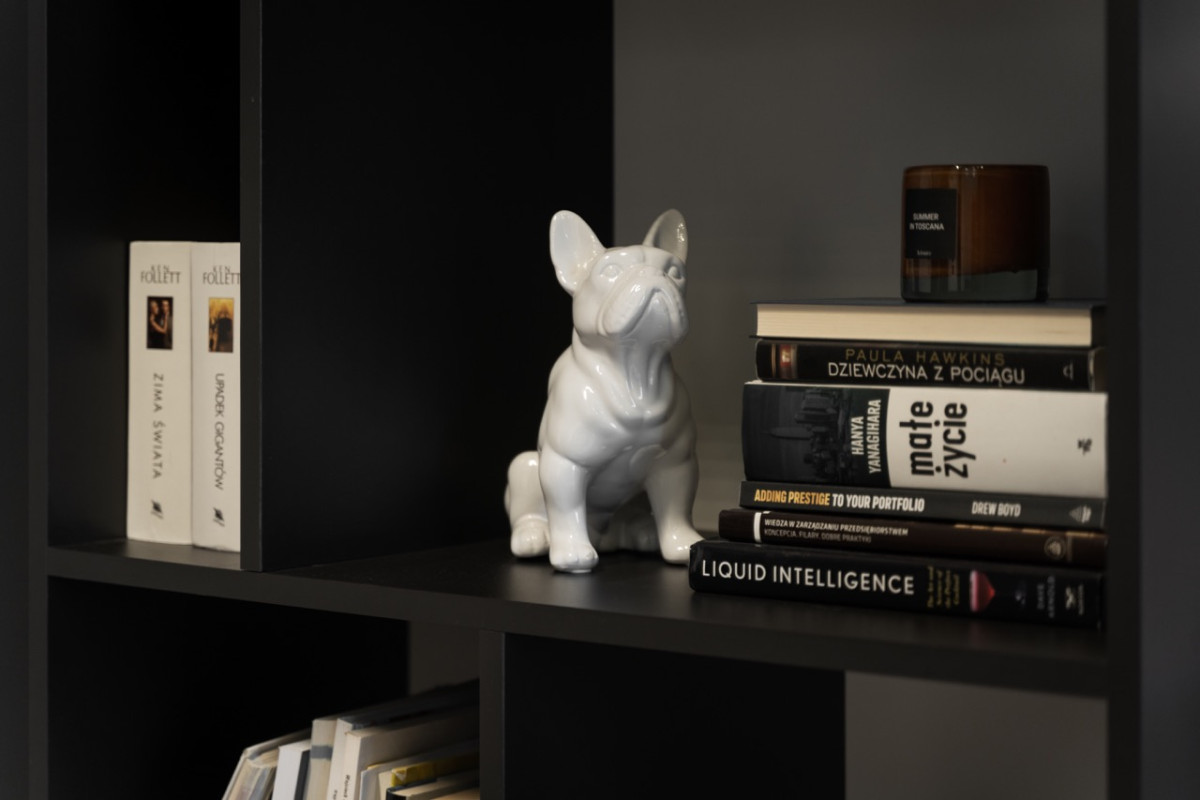 Opisując to wnętrze nie można nie wspomnieć o trzecim jego mieszkańcu. Na jego obecność wskazują bowiem liczne detale aranżacyjne, które Sandra Białkowska świadomie, acz subtelnie wprowadziła w domową przestrzeń. Figurka buldoga dumnie strzeżąca księgozbioru inwestorki, jego wizerunek na zabawnych plakatach czy domowych tekstyliach zdradzają, że z parą właścicieli mieszka ich pupilek – uroczy buldog Asti. Podkreślają tym samym, jak bardzo dużą uwagę projektantka przywiązuje do personalizacji wnętrz. Świadomie wsłuchuje się w potrzeby klientów, tworząc realizacje w pełni odzwierciedlające ich osobowość. A że udaje się jej to nadzwyczaj dobrze, świadczy nie tylko realizacja tego wnętrza, ale i fakt, że projektantka zaprzyjaźniła się z inwestorami, do dziś bywając mile widzianym gościem w ich przytulnym gniazdku.