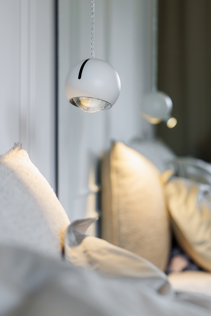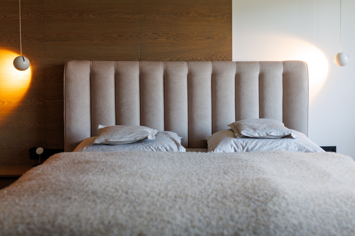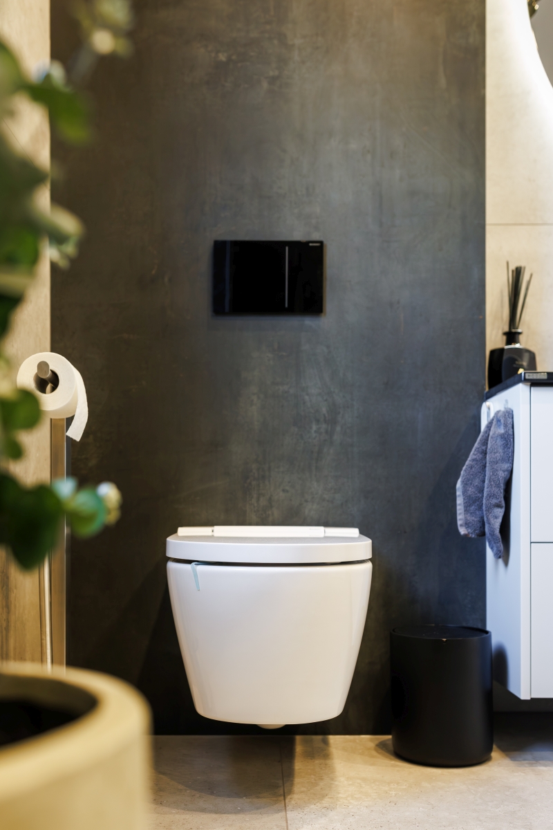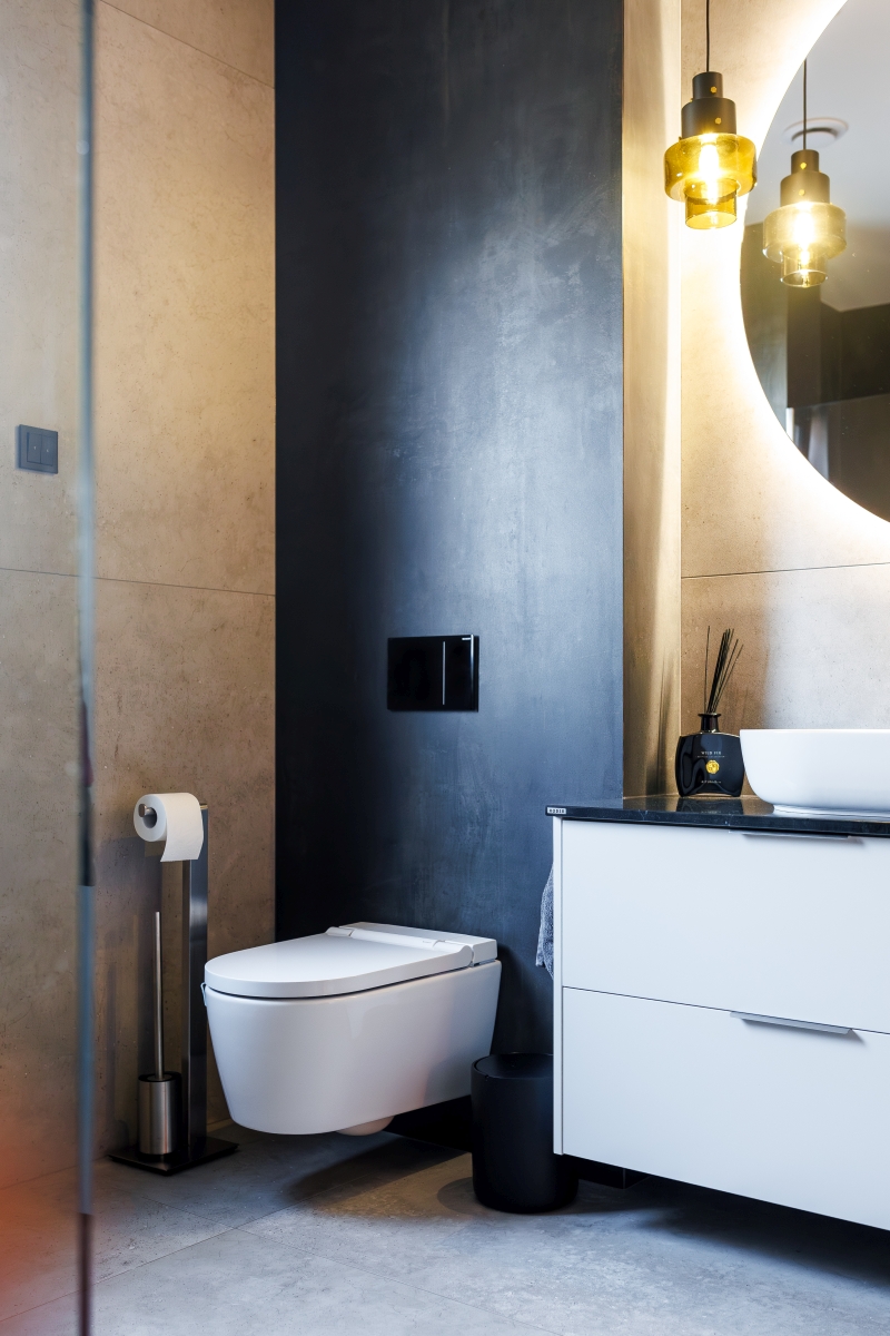 Równie funkcjonalne są pomieszczenia prywatne, urządzone w tej samej konwencji, co strefa dzienna. Zapewniając komfort i wygodę, prezentują się nowocześnie i ponadczasowo. O tym, jak dobrze wpisują się w założenia całego projektu przekonuje wystrój łazienki. Na tle imitujących naturalne materiały okładzin niezwykle efektownie prezentują się nowoczesne meble i wyposażenie. Tak jednak jak w przypadku pozostałych wnętrz, najważniejsza jest tu funkcja. Stąd za efektownym wzornictwem, kryje się wiele praktycznych rozwiązań. Najlepszym na to przykładem jest toaleta myjąca Geberit AquaClean Sela, która pojawiła się na życzenie ceniących sobie wygodę inwestorów. W strefie WC nie zabrakło również przycisku spłukującego Sigma70 i stelaża podtynkowego również z portfolio marki Geberit.
