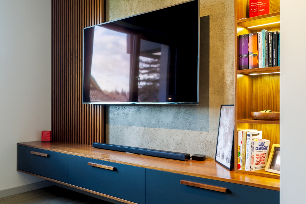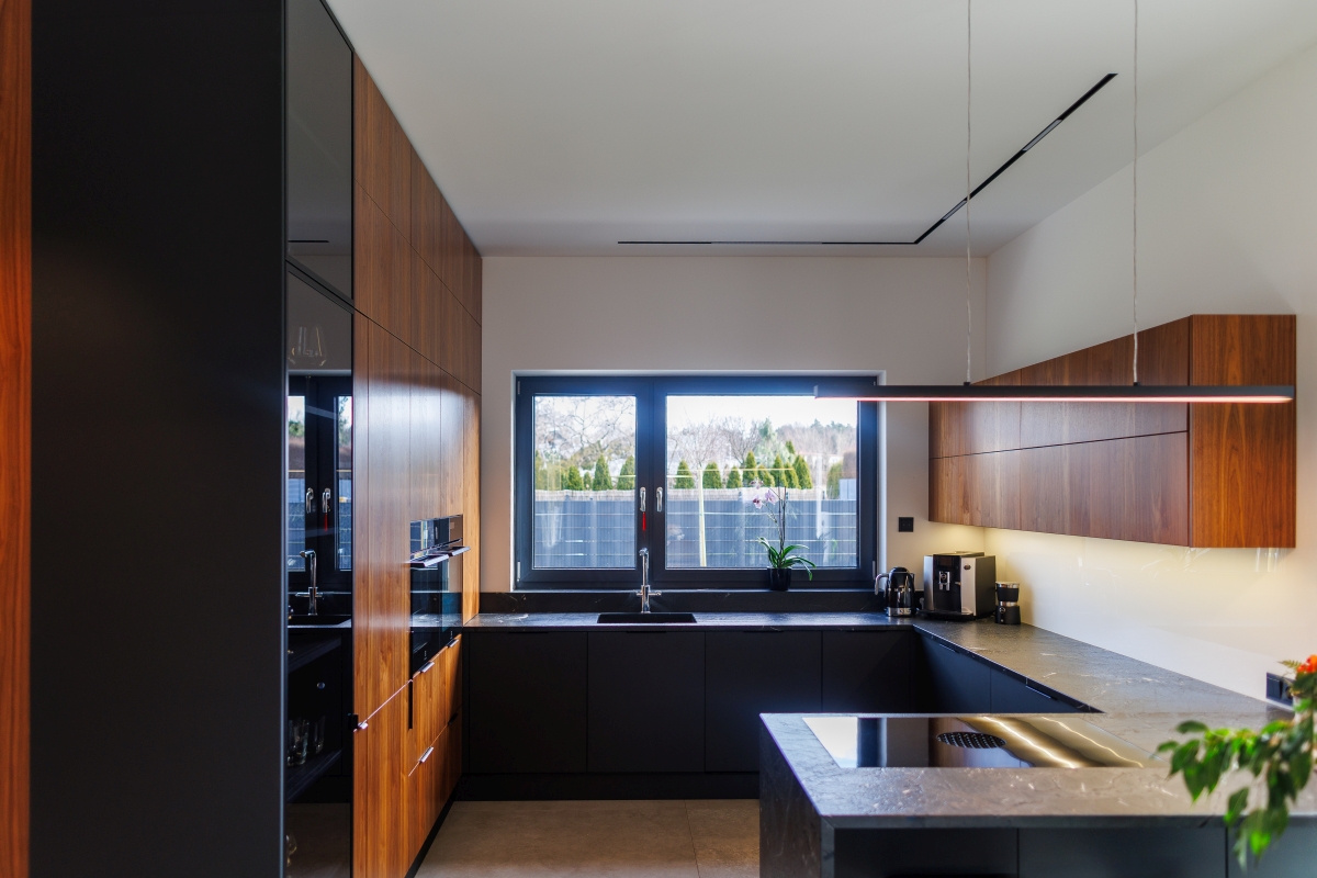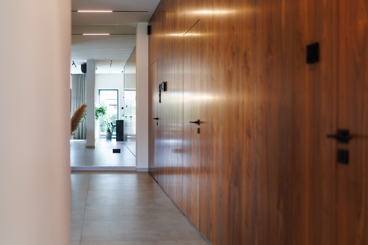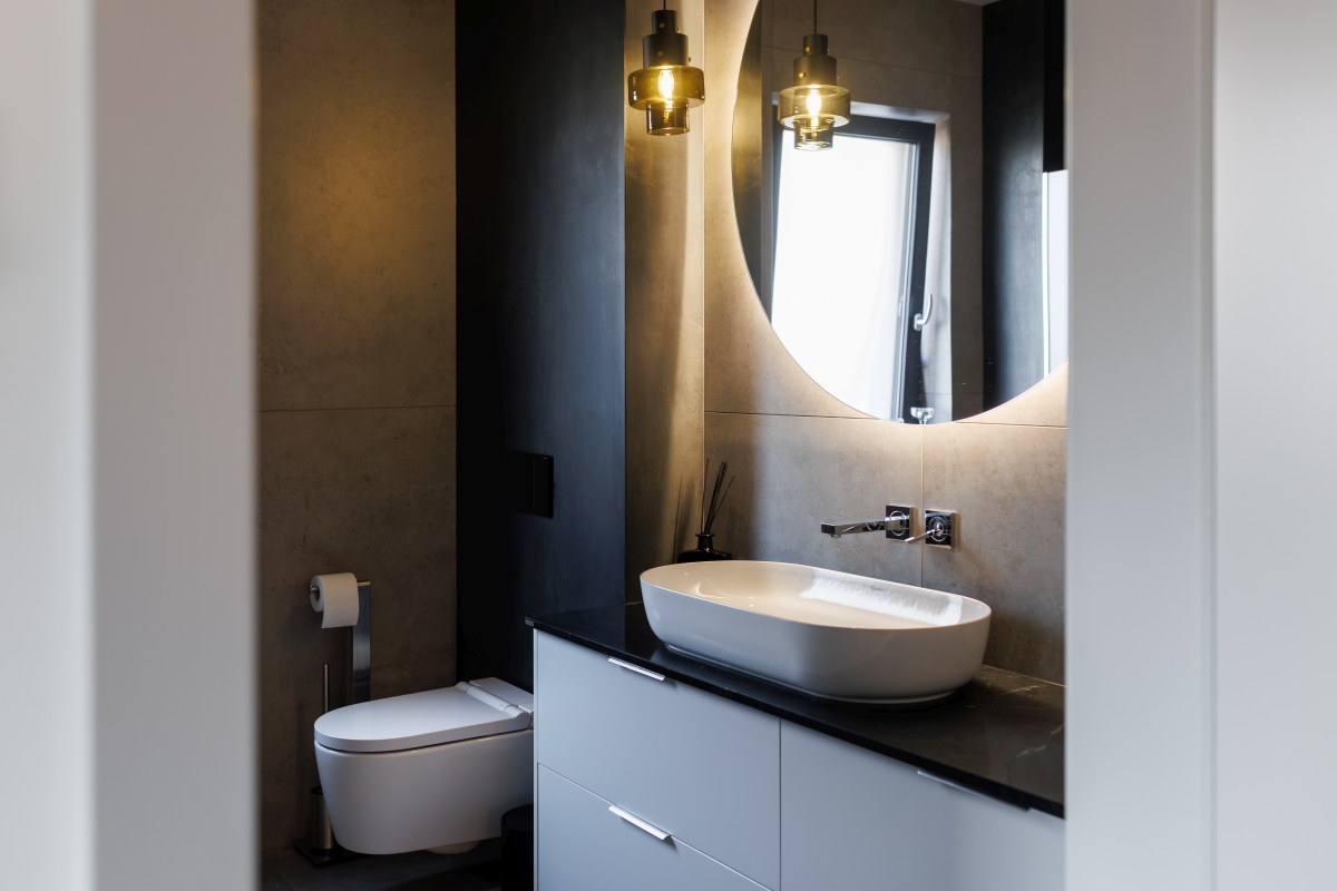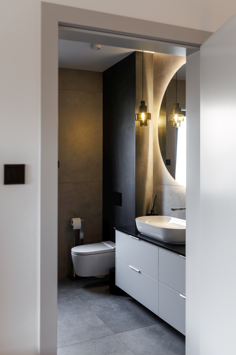 – Inwestorzy położyli nacisk na funkcjonalność, nowoczesność i minimalizm. Kolorystyka domu miała być spójna i ponadczasowa. Zdecydowaliśmy się na szarość z czarnymi akcentami oraz ciepły fornir orzechowy. W ten sposób motto „Chcemy mieć wygodnie!” zostało spełnione – wspomina projektantka wnętrz Katarzyna Szramek, ambasadorka marki Geberit.