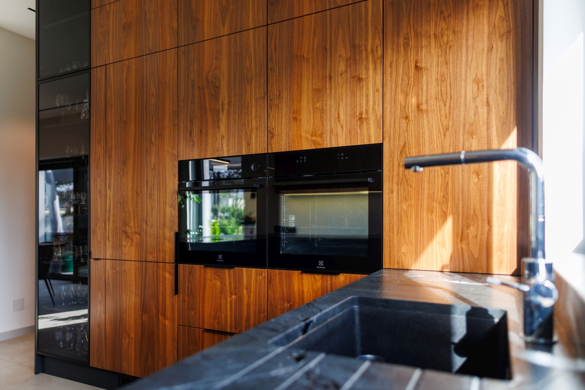 Z jadalni już tylko krok do kuchni, w której panoramiczne widoki zza okien kompensuje rysunek drewna wyeksponowany na frontach wysokiej zabudowy. Przywołuje obraz natury i jej piękno, dodając wnętrzu ponadczasowej elegancji. I choć pozostaje on na pierwszym planie, pomieszczenie ma przede wszystkim charakter funkcjonalny. Praktyczna zabudowa skrywa w sobie sprzęty AGD i zapewnia optimum miejsca do przechowywania, także dekoracyjnego szkła i porcelany. Granitowe blaty, wieńczące szafki dolne, oferują wygodną przestrzeń do przygotowywania posiłków. Całość domyka wygodna wyspa, gdzie można zjeść szybki posiłek.