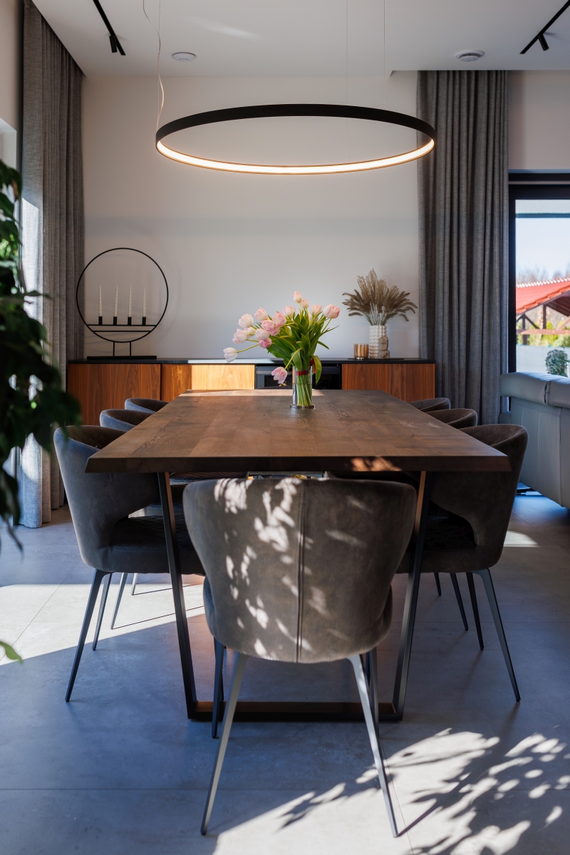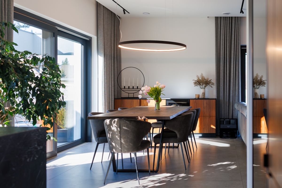 Sercem aranżacji jest salon podporządkowany funkcjom relaksacji i wspólnej zabawy. Wygodny wypoczynek zapewnia rodzinna sofa narożna, która gwarantuje miejsce dla każdego domownika, ale też gości. Usytuowana centralnie podkreśla wypoczynkową rolę wnętrza, a jednocześnie domyka przestrzeń salonową. Umiejscowiony tuż za nią duży stół jadalniany organizuje przestrzeń do wspólnego spożywania posiłków. Obie strefy użytkowe tworzą spójną wizualnie całość, gdzie elementy z forniru orzechowego ocieplają stonowane szarości. Główną dekorację stanowi tu widok na ogród, którego pejzaż zmienia się w zależności od pory roku, za każdym razem zapewniając świeże odczucia estetyczne. Dzięki dużym przeszkleniom natura śmiało tu wkracza do wnętrz, pozwalając zaczerpnąć głębokiego oddechu mieszkańcom.