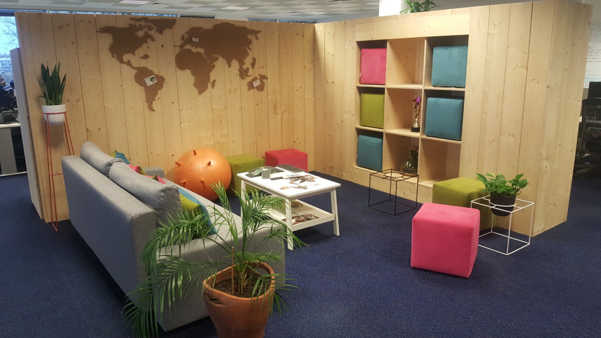 W efekcie końcowym wyszło z tego kilka elementów. Każda przestrzeń odpowiada na potrzeby danego działu. Wyodrębniona została strefa relaksu z grami (jak np. stołem do ping ponga, piłkarzykami i rzutkami), powierzchnia gastronomicza została urządzona zgodnie z trendami eko i wyposażona np. w jednorazowe papierowe kubki lub szklane butelki na wodę. Na ścianach pojawiły się elementy dekoracyjne, a na szafkach natura – w tym przypadku tzw. las w słoiku. – „Wprowadzenie elementów natury do biur, dzięki wprowadzeniu żywych roślin do przestrzeni biurowych zwiększa się wydajność i samopoczucie, a to bezpośrednio wpływa na zyski firmy. Dobre samopoczucie pracownika to obecnie najważniejszy priorytet każdego pracodawcy.” – potwierdza Rafał Grudziąż z pracowni architektonicznej 81.waw.pl.